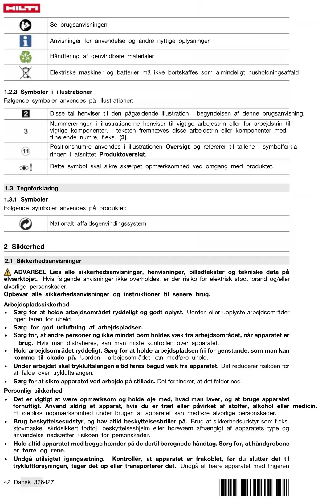 Der benyttes følgende symboler i denne brugsanvisning:42 Dansk 376427 *376427* Se brugsanvisningen Anvisninger for anvendelse og andre nyttige oplysninger Håndtering af genvindbare materialer Elektriske maskiner og batterier må ikke bortskaffes som almindeligt husholdningsaffald
