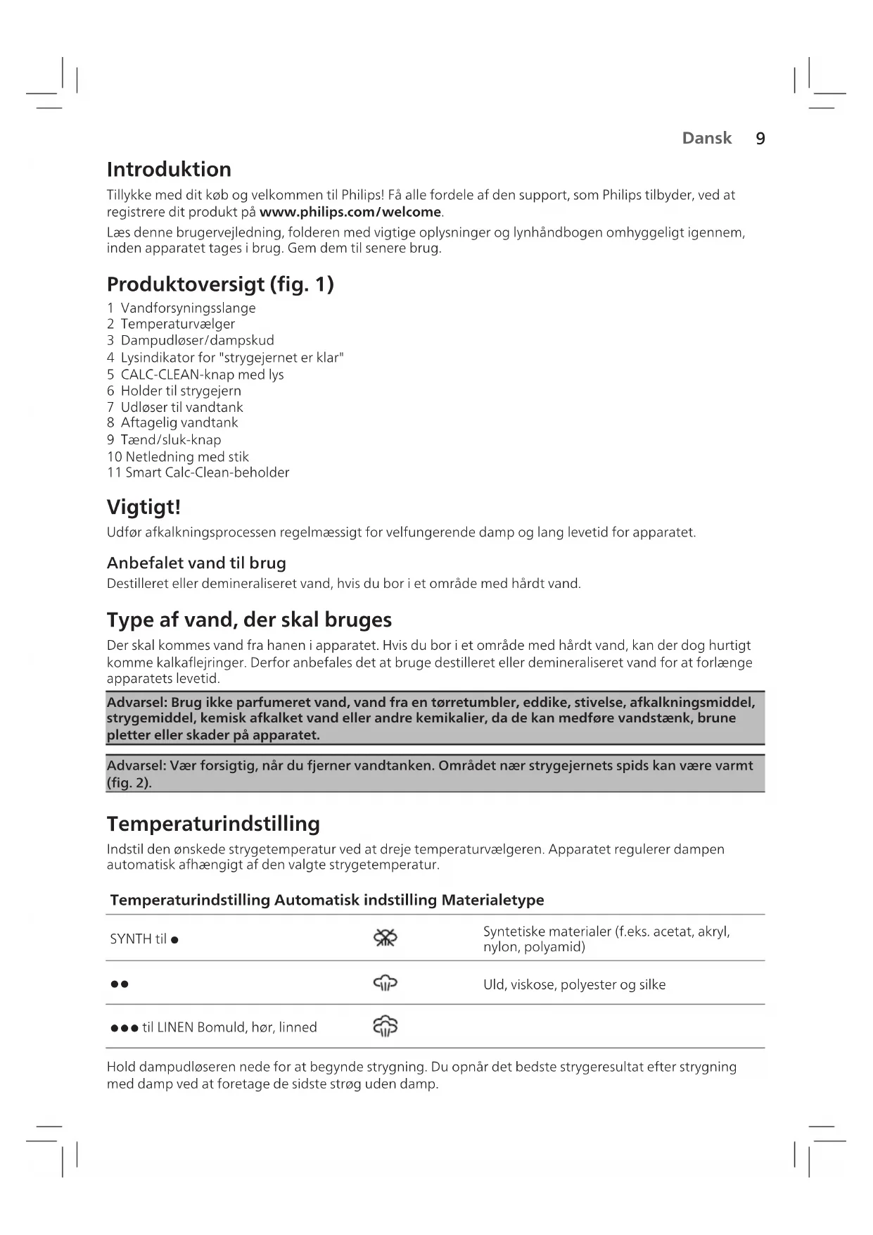 Uld, viskose, polyester og silke 3 til LINEN Bomuld, hør, linned Hold dampudløseren nede for at begynde strygning. Du opnår det bedste strygeresultat efter strygning med damp ved at foretage de sidste strøg uden damp.10 Auto-sluk-tilstand Specikke modeller i denne serie har en auto-sluk-tilstand. - For at spare energi slukker apparatet automatisk, når det ikke har været i brug i 5 minutter. Lysindikatoren for "strygejernet er klar" blinker. - Aktiver apparatet igen ved at indstille on/o-knappen til positionen "o" og derefter til "on". Apparatet begynder så at varme op igen. Rengøring og vedligeholdelse Smart Calc-Clean-system Apparatet er udstyret med et Smart Calc-Clean-system for at sikre, at afkalkning og rengøring foretages regelmæssigt. Derved bibeholdes en imponerende dampproduktion, og det forhindres, at der med tiden kommer snavs og pletter ud fra strygesålen. Dampgeneratoren udsender regelmæssige påmindelser om at huske at rengøre apparatet. Lyd- og indikatorpåmindelse om Calc-Clean Efter 1 til 3 måneders brug begynder Calc-Clean-indikatoren at blinke, og apparatet begynder at bippe for at minde dig om at foretage afkalkningen )g. 3(. Tip: Du kan fortsætte med tør strygning ved ikke at trykke på dampudløseren. Ud over dette har dampgeneratoren et andet indbygget trin til beskyttelse imod kalkaejringer: Dampfunktionen deaktiveres, hvis afkalkningen ikke udføres. Efter afkalkningen er udført, genaktiveres dampfunktionen. Dette sker, uanset hvilken type vand der anvendes. Bemærk: Afkalkning kan foretages når som helst, selv når lyd- og indikatorpåmindelsen endnu ikke er aktiveret. Afkalkning med Calc-Clean-beholderen Advarsel: Lad ikke apparatet være uden opsyn under afkalkningen. Advarsel: Du må ikke afbryde processen ved at løfte strygejernet op fra Calc-Clean-beholderen, da varmt vand og damp kommer ud fra strygesålen. 1 Fyld vandtanken halvvejs op )g. 4(. Bemærk: Sørg for, at apparatets ledning er sat i stikkontakten og tændt )ON( under afkalkningen. 2 Placer Calc-Clean-beholderen på strygebrættet eller et andet jævnt og stabilt underlag. 3 Sæt strygejernet stabilt på Calc-Clean-beholderen )g. 5(. Bemærk: Calc-Clean-beholderen opsamler kalkpartikler og varmt vand under afkalkningen. Det er helt sikkert at stille strygejernet på denne beholder undervejs. 4 Hold Calc-Clean-knappen nede i 2 sekunder, indtil du hører korte bip )g. 6(. 5 Under afkalkningen kan du høre korte biplyde og en pumpelyd )g. 7(. 6 Når afkalkningen er færdig, holder strygejernet op med at bippe, og CALC-CLEAN-indikatoren holder op med at blinke )g. 8(. 7 Tør strygejernet af med en klud, og stil det tilbage i basestationen )g. 9(. 8 Calc-Clean-beholderen bliver varm under afkalkningsprocessen, så vent ca. 5 minutter, inden du rører ved den. Flyt derefter Calc-Clean-beholderen hen til vasken, tøm den, og opbevar den til senere brug )g.10(. 9 Hvis det er nødvendigt, kan du gentage trin 1 til 7. Sørg for at tømme Calc-Clean-beholderen, før du påbegynder afkalkningen. Bemærk: Under afkalkningen kan der komme rent vand ud fra strygesålen, hvis der ikke har samlet sig kalk inde i strygejernet. Dette er normalt. Dansk11 Dansk Fejlnding I dette kapitel beskrives de mest almindelige problemer, der kan opstå med dit apparat. Hvis du ikke kan løse problemet ved hjælp af nedenstående oplysninger, kan du nde en liste over ofte stillede spørgsmål på www.philips.com/support. Du er også altid velkommen til at kontakte dit lokale Philips Kundecenter. Problem Mulig årsag Løsning Strygejernet producerer ingen damp. Du har indstillet temperaturvælgeren til SYNTH til 1. Indstil temperaturvælgeren til 2 eller højere. Dampfunktionen er blevet deaktiveret, indtil du er færdig med afkalkningen. Foretag afkalkningen for at aktivere dampfunktionen igen )se afsnittet "Rengøring og vedligeholdelse"(. Dampudløseren har i starten af strygningen ikke været trykket ned længe nok. Hold dampudløseren nede, indtil der kommer damp ud. Det kan tage op til 30 sekunder, før der kommer damp ud. Calc Clean-indikatoren blinker. Der kommer ingen damp ud af strygesålen, og/eller apparatet bipper. Du har ikke foretaget eller ikke afsluttet afkalkningen. Foretag afkalkningen for at aktivere dampfunktionen igen )se afsnittet "Rengøring og vedligeholdelse"(. Apparatet er slukket. Auto-sluk-funktionen aktiveres automatisk, når apparatet ikke er blevet brugt i mere end 5 minutter. Aktiver apparatet igen ved at indstille on/ o-knappen til positionen "o" og derefter til "on". Apparatet begynder så at varme op igen. Der høres en høj pumpelyd fra apparatet. Vandtanken er tom. Fyld vandtanken med vand, og tryk på dampudløseren, indtil pumpelyden bliver svagere, og der kommer damp ud fra strygesålen. Der drypper vand ud fra strygesålen. Efter afkalkningen kan eventuelt resterende vand dryppe ud fra strygesålen. Tør strygesålen af med en klud. Hvis Calc-Clean-indikatoren stadig blinker, og apparatet stadig bipper, foretages afkalkningen )se kapitlet "Rengøring og vedligeholdelse"(. Snavset vand og urenheder )brune pletter, hvide ager osv.( kommer ud af strygesålen. Urenheder eller kemikalier i vandet kan have aejret sig i damphullerne og/eller på strygesålen. Afkalk regelmæssigt )se kapitlet "Rengøring og vedligeholdelse"(. Der strømmer vand ud fra strygesålen. Du har utilsigtet sat afkalkningen i gang )se kapitlet "Rengøring og vedligeholdelse"(. Sluk for apparatet. Tænd derefter for det igen. Lad strygejernet varme op, indtil indikatoren for "strygejernet er klar" lyser konstant.12 Deutsch Einführung Herzlichen Glückwunsch zu Ihrem Kauf und willkommen bei Philips! Um die Unterstützung von Philips optimal nutzen zu können, sollten Sie Ihr Produkt unter www.philips.com/welcome registrieren. Lesen Sie diese Bedienungsanleitung, die Broschüre mit wichtigen Informationen und die Kurzanleitung sorgfältig durch, bevor Sie das Gerät verwenden. Heben Sie sie zur später