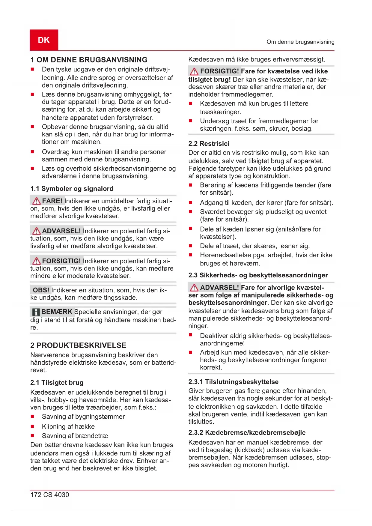 FARE! Indikerer en umiddelbar farlig situati- on, som, hvis den ikke undgås, er livsfarlig eller medfører alvorlige kvæstelser. ADVARSEL! Indikerer en potentiel farlig si- tuation, som, hvis den ikke undgås, kan være livsfarlig eller medføre alvorlige kvæstelser. FORSIGTIG! Indikerer en potentiel farlig si- tuation, som, hvis den ikke undgås, kan medføre mindre eller moderate kvæstelser. OBS! Indikerer en situation, som, hvis den ik- ke undgås, kan medføre tingsskade. BEMÆRK Specielle anvisninger, der gør dig i stand til at forstå og håndtere maskinen bed- re. 2 PRODUKTBESKRIVELSE Nærværende brugsanvisning beskriver den håndstyrede elektriske kædesav, som er batterid- revet.