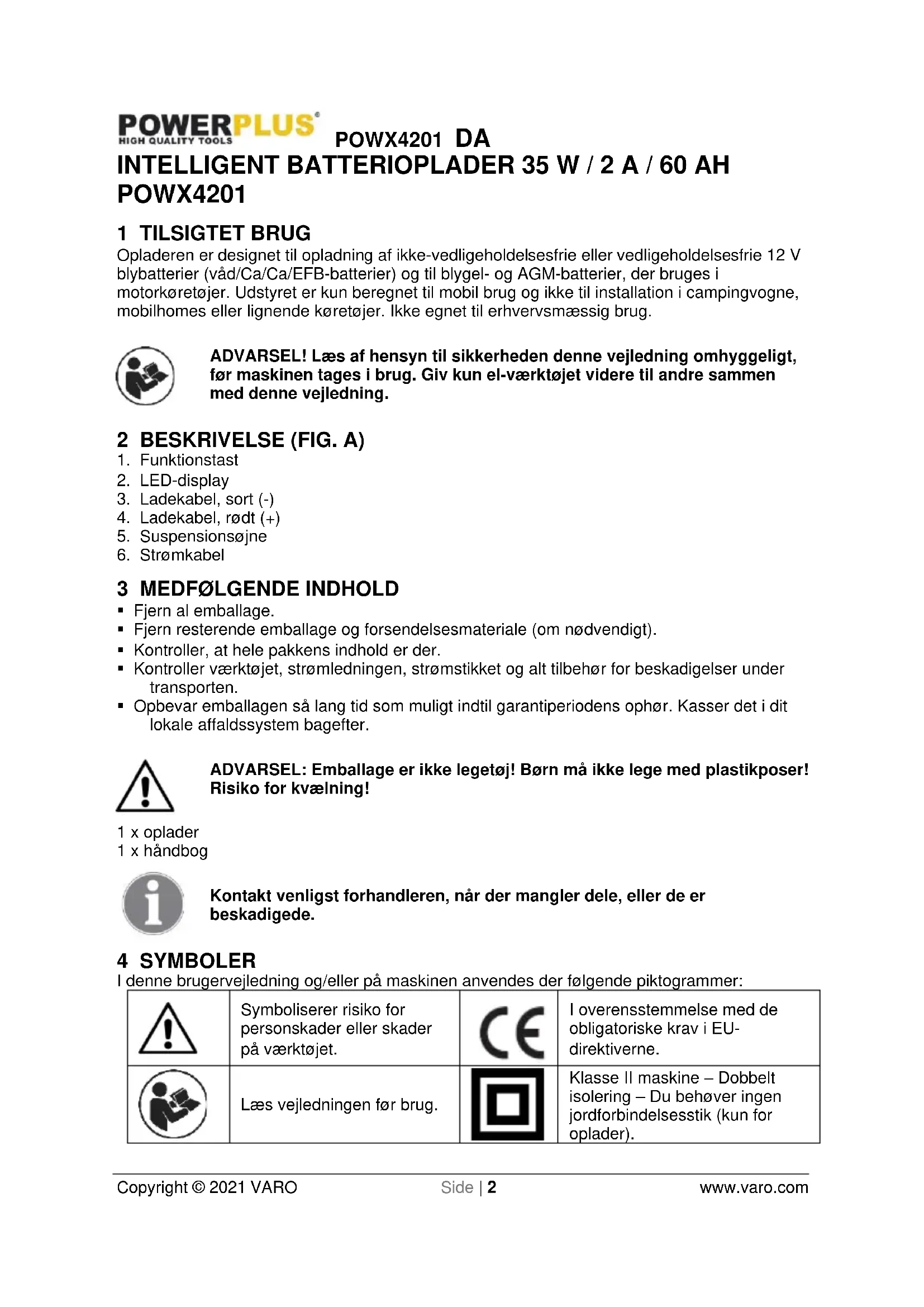 - Udstyret kan ikke bruges som bufferforsyning, f.eks. mens du skifter et batteri. 7 BETJENING Før du slutter strøm tiludstyret, skal du sikre, at dataene på specifikationsmærkaten stemmer overnes med netkablets data. ADVARSEL: Oplad ikke frosne batterier.POWX4201 DA Copyright © 2021 VARO Side | 5 www.varo.com