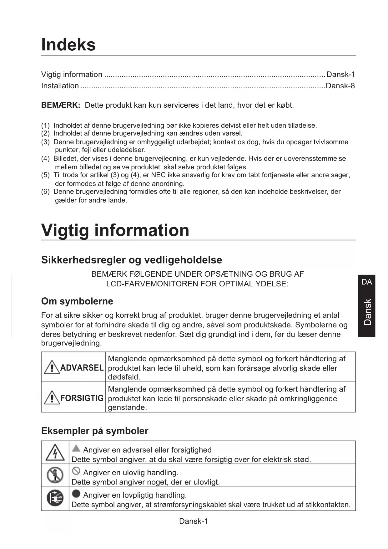 Dansk Vigtig information ......................................................................................................Dansk-1 Installation .................................................................................................................Dansk-8 Indeks BEMÆRK: Dette produkt kan kun serviceres i det land, hvor det er købt. (1) Indholdet af denne brugervejledning bør ikke kopieres delvist eller helt uden tilladelse.(2) Indholdet af denne brugervejledning kan ændres uden varsel.(3) Denne brugervejledning er omhyggeligt udarbejdet; kontakt os dog, hvis du opdager tvivlsomme punkter, fejl eller udeladelser.(4) Billedet, der vises i denne brugervejledning, er kun vejledende. Hvis der er uoverensstemmelse mellem billedet og selve produktet, skal selve produktet følges.(5) Til trods for artikel (3) og (4), er NEC ikke ansvarlig for krav om tabt fortjeneste eller andre sager, der formodes at følge af denne anordning.(6) Denne brugervejledning formidles ofte til alle regioner, så den kan indeholde beskrivelser, der gælder for andre lande. Vigtig information Sikkerhedsregler og vedligeholdelse BEMÆRK FØLGENDE UNDER OPSÆTNING OG BRUG AF LCD-FARVEMONITOREN FOR OPTIMAL YDELSE: Om symbolerne For at sikre sikker og korrekt brug af produktet, bruger denne brugervejledning et antal symboler for at forhindre skade til dig og andre, såvel som produktskade. Symbolerne og deres betydning er beskrevet nedenfor. Sæt dig grundigt ind i dem, før du læser denne brugervejledning. ADVARSEL Manglende opmærksomhed på dette symbol og forkert håndtering af produktet kan lede til uheld, som kan forårsage alvorlig skade eller dødsfald. FORSIGTIG Manglende opmærksomhed på dette symbol og forkert håndtering af produktet kan lede til personskade eller skade på omkringliggende genstande. Eksempler på symboler Angiver en advarsel eller forsigtighed Dette symbol angiver, at du skal være forsigtig over for elektrisk stød. Angiver en ulovlig handling. Dette symbol angiver noget, der er ulovligt. Angiver en lovpligtig handling. Dette symbol angiver, at strømforsyningskablet skal være trukket ud af stikkontakten.Dansk-2 ADVARSEL