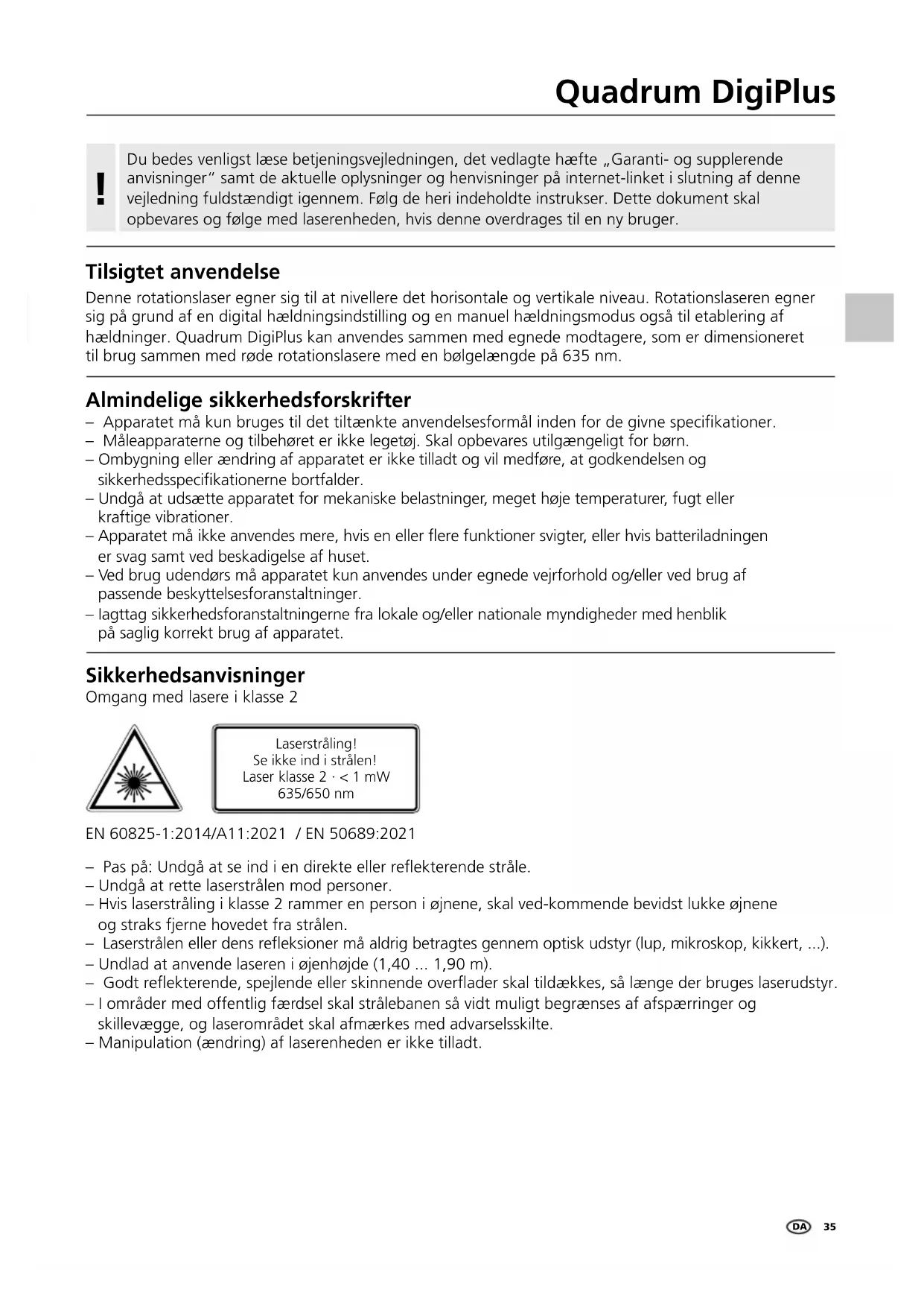 Tilsigtet anvendelse Denne rotationslaser egner sig til at nivellere det horisontale og vertikale niveau. Rotationslaseren egner sig på grund af en digital hældningsindstilling og en manuel hældningsmodus også til etablering af hældninger. Quadrum DigiPlus kan anvendes sammen med egnede modtagere, som er dimensioneret til brug sammen med røde rotationslasere med en bølgelængde på 635 nm. Almindelige sikkerhedsforskrifter – Apparatet må kun bruges til det tiltænkte anvendelsesformål inden for de givne specikationer. – Måleapparaterne og tilbehøret er ikke legetøj. Skal opbevares utilgængeligt for børn. – Ombygning eller ændring af apparatet er ikke tilladt og vil medføre, at godkendelsen og sikkerhedsspecikationerne bortfalder. – Undgå at udsætte apparatet for mekaniske belastninger, meget høje temperaturer, fugt eller kraftige vibrationer. – Apparatet må ikke anvendes mere, hvis en eller ere funktioner svigter, eller hvis batteriladningen er svag samt ved beskadigelse af huset. – Ved brug udendørs må apparatet kun anvendes under egnede vejrforhold og/eller ved brug af passende beskyttelsesforanstaltninger. – Iagttag sikkerhedsforanstaltningerne fra lokale og/eller nationale myndigheder med henblik på saglig korrekt brug af apparatet. – Pas på: Undgå at se ind i en direkte eller reekterende stråle. – Undgå at rette laserstrålen mod personer. – Hvis laserstråling i klasse 2 rammer en person i øjnene, skal ved-kommende bevidst lukke øjnene og straks fjerne hovedet fra strålen. – Laserstrålen eller dens reeksioner må aldrig betragtes gennem optisk udstyr (lup, mikroskop, kikkert, ...). – Undlad at anvende laseren i øjenhøjde (1,40 ... 1,90 m). – Godt reekterende, spejlende eller skinnende overader skal tildækkes, så længe der bruges laserudstyr. – I områder med offentlig færdsel skal strålebanen så vidt muligt begrænses af afspærringer og skillevægge, og laserområdet skal afmærkes med advarselsskilte. – Manipulation (ændring) af laserenheden er ikke tilladt. EN 60825-1:2014/A11:2021 / EN 50689:2021 Laserstråling! Se ikke ind i strålen! Laser klasse 2 · < 1 mW 635/650 nm Sikkerhedsanvisninger Omgang med lasere i klasse 236