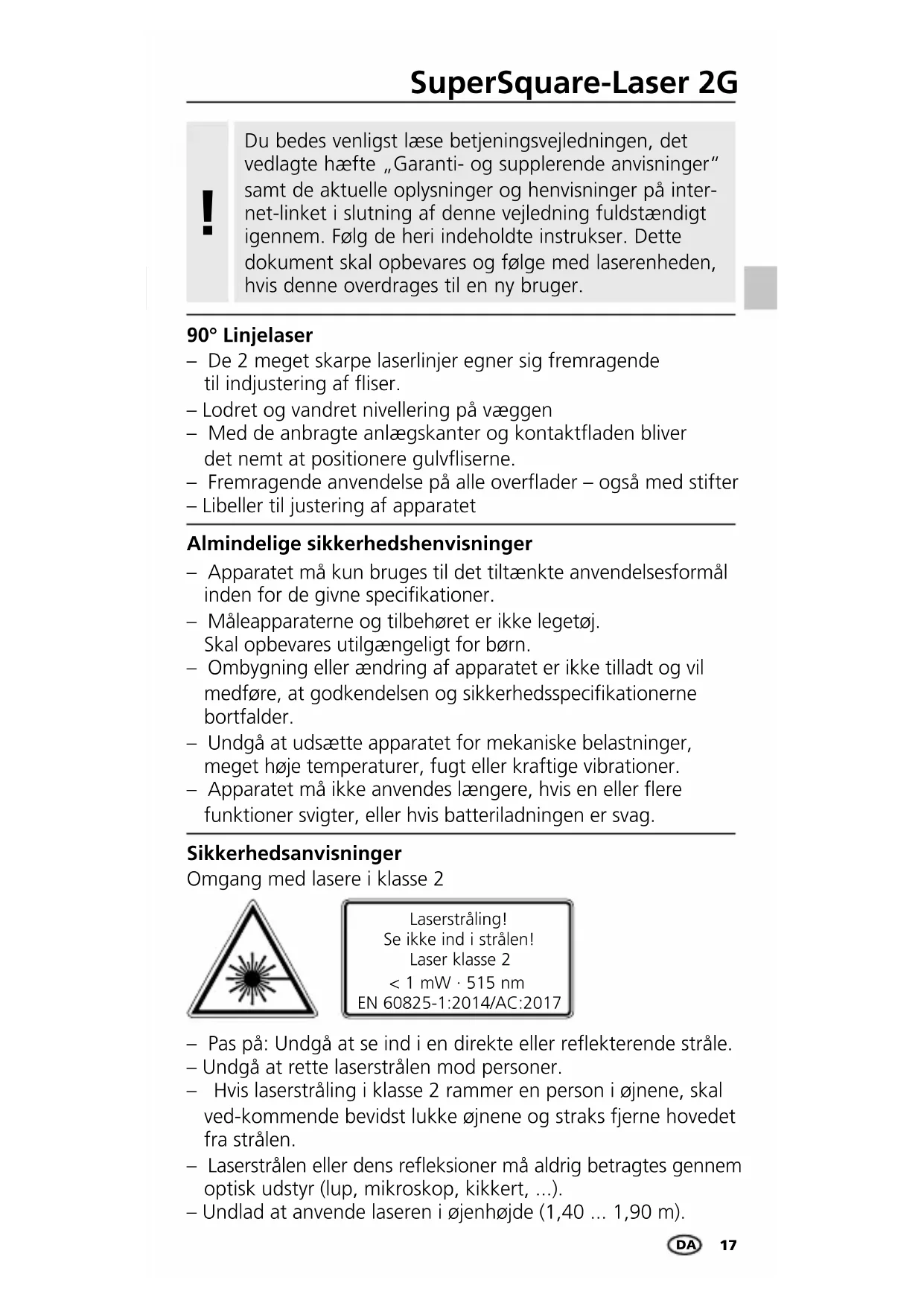Batterihus – Godt reekterende, spejlende eller skinnende overader skal tildækkes, så længe der bruges laserudstyr. – I områder med offentlig færdsel skal strålebanen så vidt muligt begrænses af afspærringer og skillevægge, og laserområdet skal afmærkes med advarselsskilte. Sikkerhedshenvisninger Omgang med elektromagnetisk stråling – Måleapparatet overholder forskrifterne og grænseværdierne for elektromagnetisk kompatibilitet iht. EMC-direktiv 2014/30/EU. – Lokale anvendelsesrestriktioner, f.eks. på hospitaler, i y eller i nærheden af personer med pacemaker, skal iagttages. Risikoen for farlig påvirkning af eller fejl i elektronisk udstyr er til stede.SuperSquare-Laser 2G