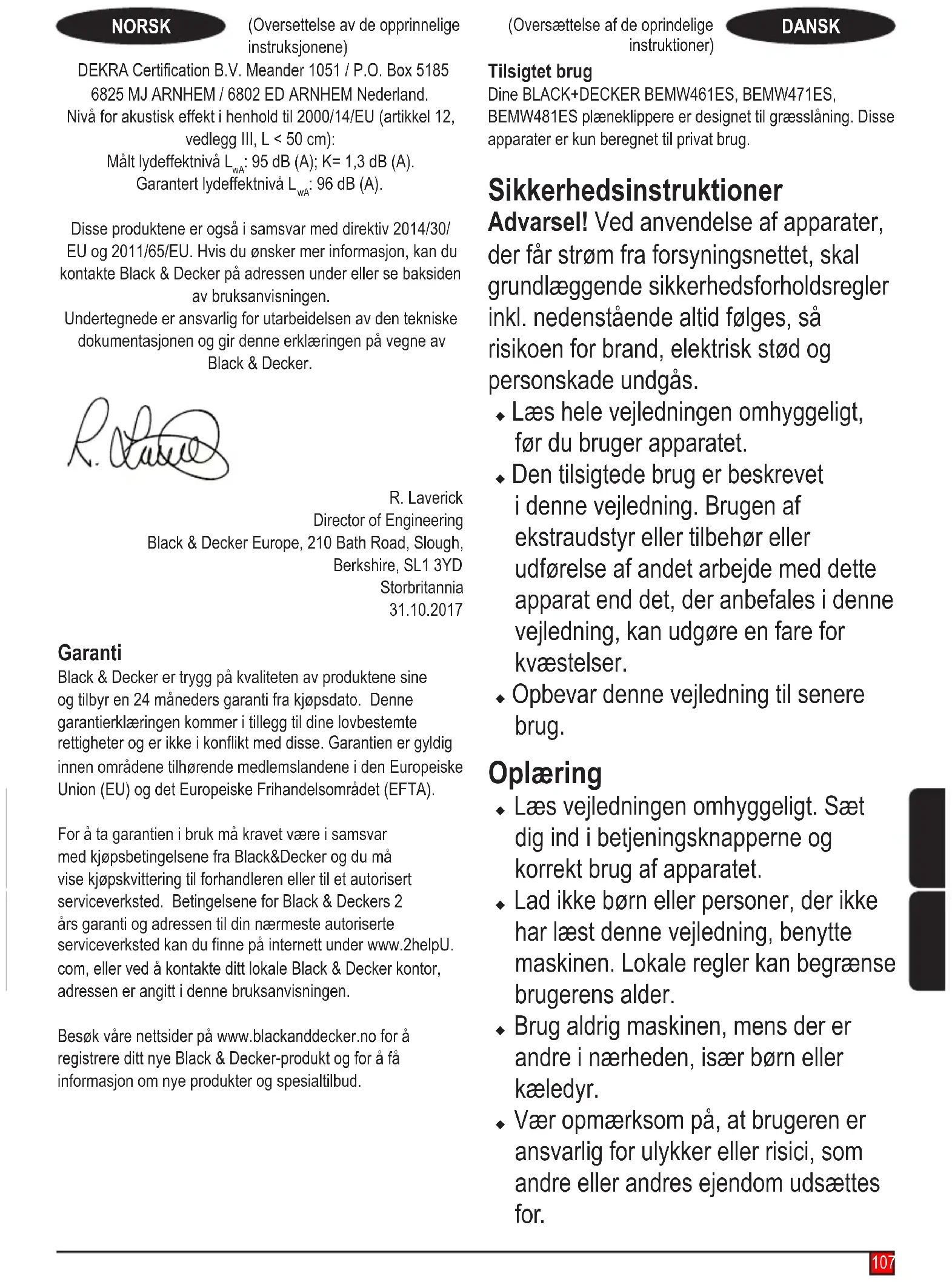 Garanti Black & Decker er trygg på kvaliteten av produktene sine og tilbyr en 24 måneders garanti fra kjøpsdato. Denne garantierklæringen kommer i tillegg til dine lovbestemte rettigheterogerikkeikoniktmeddisse.Garantienergyldig innen områdene tilhørende medlemslandene i den Europeiske Union (EU) og det Europeiske Frihandelsområdet (EFTA). For å ta garantien i bruk må kravet være i samsvar med kjøpsbetingelsene fra Black&Decker og du må vise kjøpskvittering til forhandleren eller til et autorisert serviceverksted. Betingelsene for Black & Deckers 2 års garanti og adressen til din nærmeste autoriserte serviceverkstedkandunnepåinternettunderwww.2helpU. com, eller ved å kontakte ditt lokale Black & Decker kontor, adressen er angitt i denne bruksanvisningen. Besøk våre nettsider på www.blackanddecker.no for å registrere ditt nye Black & Decker-produkt og for å få informasjon om nye produkter og spesialtilbud. Tilsigtet brug Dine BLACK+DECKER BEMW461ES, BEMW471ES, BEMW481ES plæneklippere er designet til græsslåning. Disse apparater er kun beregnet til privat brug. Sikkerhedsinstruktioner Advarsel! Ved anvendelse af apparater, der får strøm fra forsyningsnettet, skal grundlæggende sikkerhedsforholdsregler inkl. nedenstående altid følges, så risikoen for brand, elektrisk stød og personskade undgås. u Læs hele vejledningen omhyggeligt, før du bruger apparatet. u Den tilsigtede brug er beskrevet i denne vejledning. Brugen af ekstraudstyr eller tilbehør eller udførelse af andet arbejde med dette apparat end det, der anbefales i denne vejledning, kan udgøre en fare for kvæstelser. u Opbevar denne vejledning til senere brug. Oplæring u Læs vejledningen omhyggeligt. Sæt dig ind i betjeningsknapperne og korrekt brug af apparatet. u Lad ikke børn eller personer, der ikke har læst denne vejledning, benytte maskinen. Lokale regler kan begrænse brugerens alder. u Brug aldrig maskinen, mens der er andre i nærheden, især børn eller kæledyr. u Vær opmærksom på, at brugeren er ansvarlig for ulykker eller risici, som andre eller andres ejendom udsættes for.108 (Oversættelse af de oprindelige instruktioner) DANSK Klargøring u Brug altid kraftigt fodtøj og lange bukser under anvendelse af maskinen. Betjen ikke maskinen uden sko eller iført sandaler. Undgå at bære løstsiddende tøj eller tøj med hængende snore eller bånd. u Inspicer grundigt det område, hvor maskinen skal bruges, og fjern alle objekter, som maskinen kan kaste ud. u Inspicer altid visuelt, at kniven, knivbolten og knivsamlingen ikke er slidt eller beskadiget, før du bruger maskinen. Udskift slidte eller beskadigede komponenter i sæt for at bevare balancen. Udskift beskadigede eller ulæsbare etiketter. u Kontroller før brug strømforsyningsledningen og forlængerledningen for tegn på beskadigelse eller ælde. Hvis ledningen bliver beskadiget under brug, skal du omgående tage den ud af stikkontakten. RØR IKKE VED