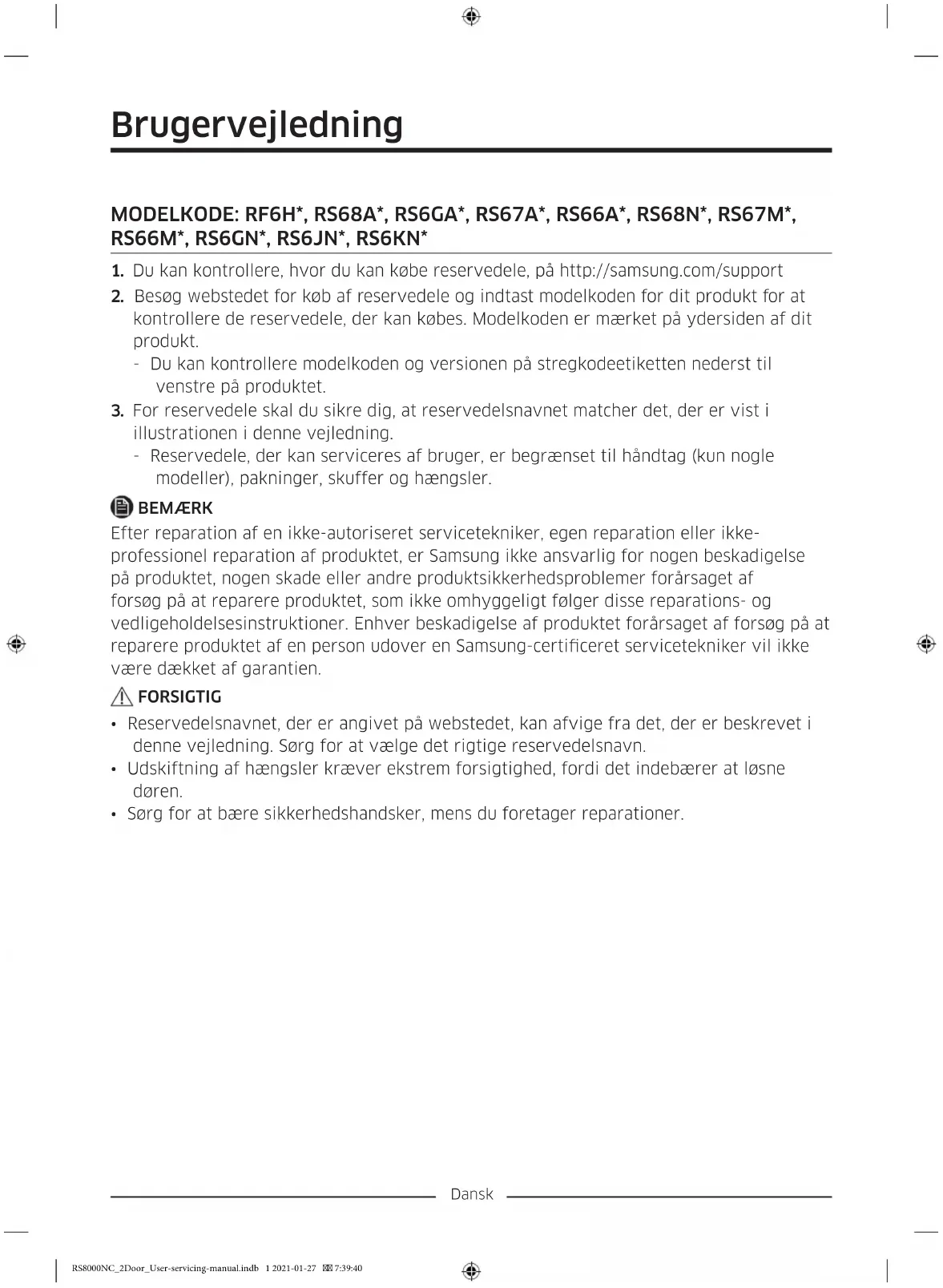 - Sørg for at bære sikkerhedshandsker, mens du foretager reparationer. RS8000NC_2Door_User-servicing-manual.indb 1 2021-01-27 7:39:40Dansk Det faktiske billede og køleskabets medfølgende dele afviger muligvis afhængigt af model og land.