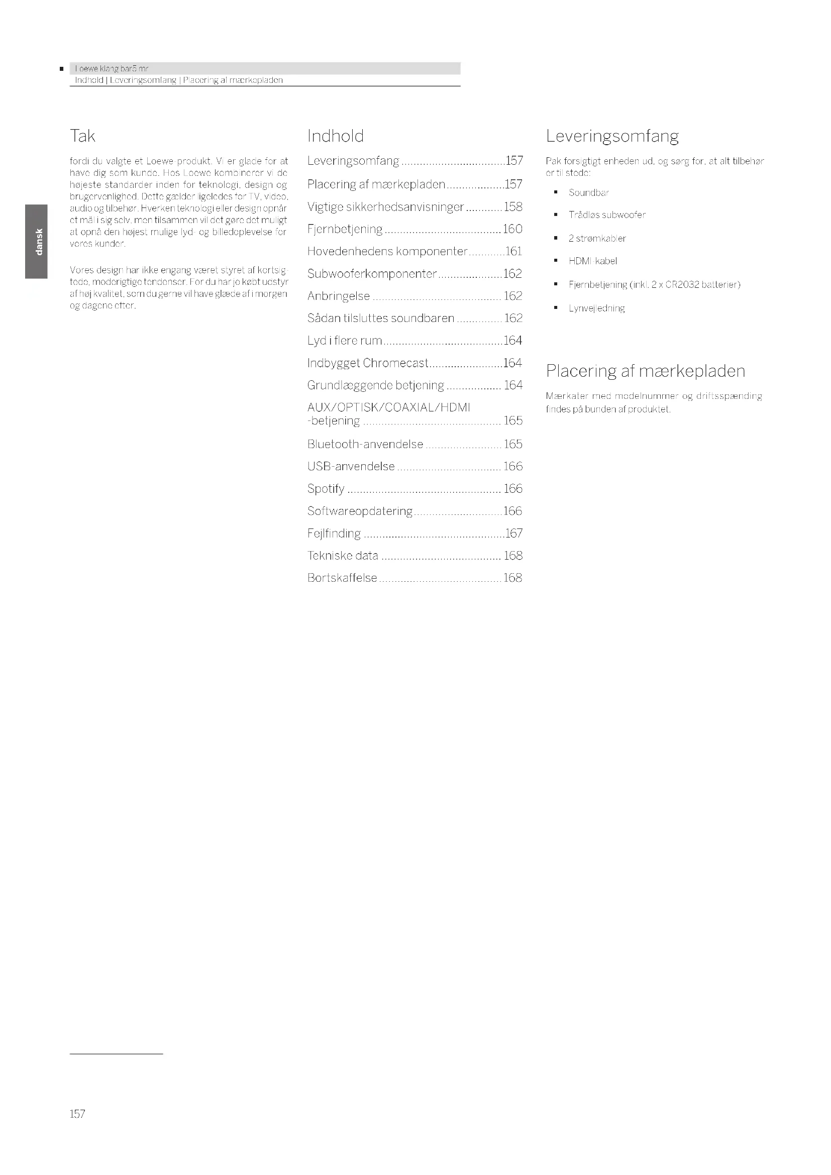 - Loewe klang bar5 mr deutsch dansk Indhold | Leveringsomfang | Placering af mærkepladen Tak fordi du valgte et Loewe-produkt. Vi er glade for at have dig som kunde. Hos Loewe kombinerer vi de højeste standarder inden for teknologi, design og brugervenlighed. Dette gælder ligeledes for TV, video, audio og tilbehør. Hverken teknologi eller design opnår et mål i sig selv, men tilsammen vil det gøre det muligt at opnå den højest mulige lyd- og billedoplevelse for vores kunder. Vores design har ikke engang været styret af kortsig- tede, moderigtige tendenser. For du har jo købt udstyr af høj kvalitet, som du gerne vil have glæde af i morgen og dagene efter. Indhold Leveringsomfang p. 157