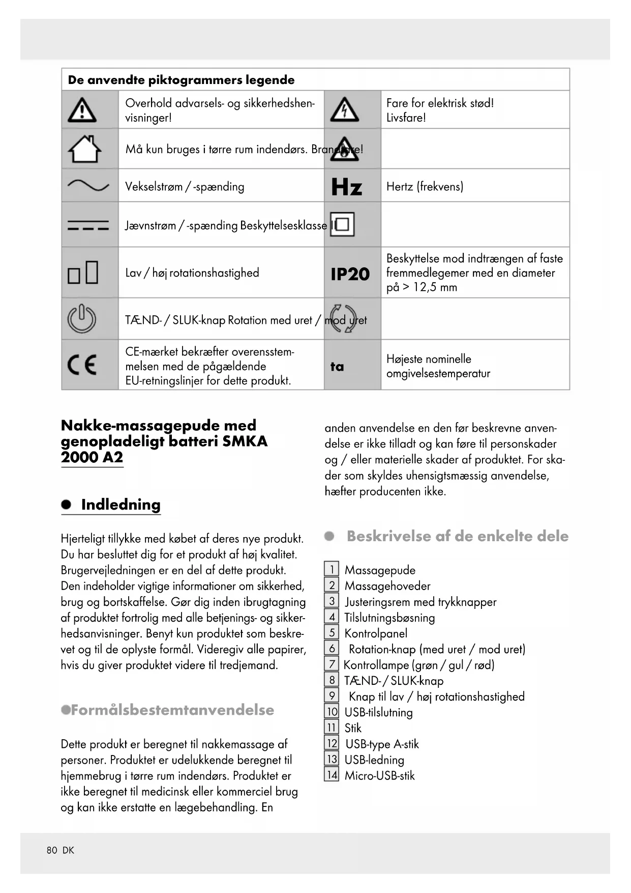 Højeste nominelle omgivelsestemperatur Nakke-massagepude med genopladeligt batteri SMKA 2000 A2 Indledning Hjerteligt tillykke med købet af deres nye produkt. Du har besluttet dig for et produkt af høj kvalitet. Brugervejledningen er en del af dette produkt. Den indeholder vigtige informationer om sikkerhed, brug og bortskaffelse. Gør dig inden ibrugtagning af produktet fortrolig med alle betjenings- og sikker- hedsanvisninger. Benyt kun produktet som beskre- vet og til de oplyste formål. Videregiv alle papirer, hvis du giver produktet videre til tredjemand. Formålsbestemt anvendelse Dette produkt er beregnet til nakkemassage af personer. Produktet er udelukkende beregnet til hjemmebrug i tørre rum indendørs. Produktet er ikke beregnet til medicinsk eller kommerciel brug og kan ikke erstatte en lægebehandling. En anden anvendelse en den før beskrevne anven- delse er ikke tilladt og kan føre til personskader og / eller materielle skader af produktet. For ska- der som skyldes uhensigtsmæssig anvendelse, hæfter producenten ikke. Beskrivelse af de enkelte dele