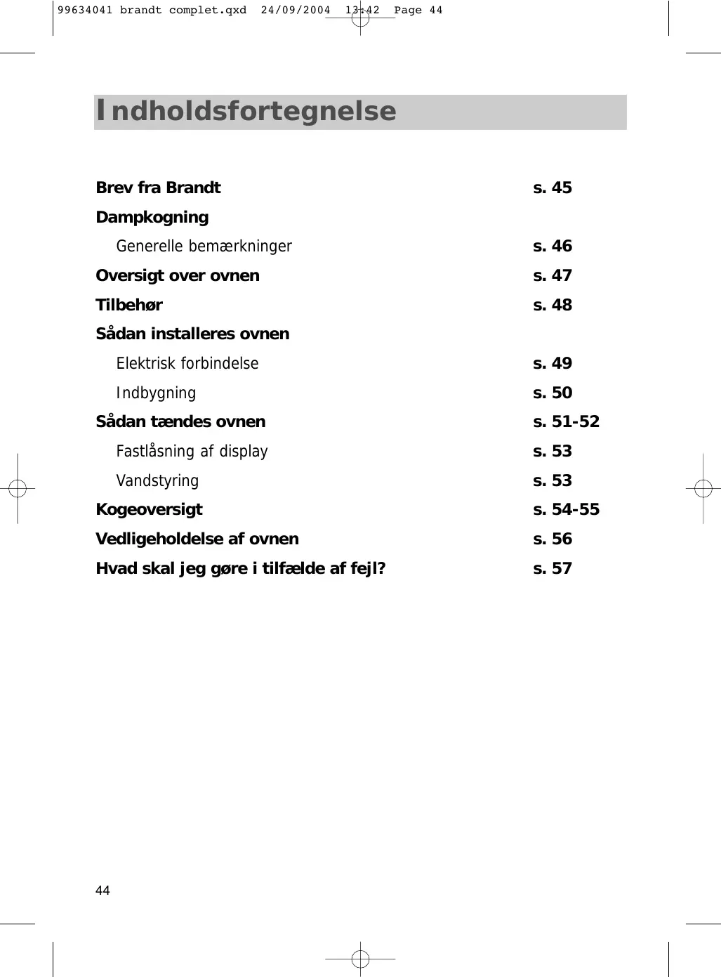 99634041 brandt complet.qxd 24/09/2004 13:42 Page 44 I ndholdsfortegnelse Brev fra Brandt s. 45 Dampkogning Generelle bemærkninger s. 46 Oversigt over ovnen s. 47 Tilbehør s. 48 Sådan installeres ovnen Elektrisk forbindelse s. 49 Indbygning s. 50 Sådan tændes ovnen s. 51-52 Fastlåsning af display s. 53 Vandstyring s. 53 Kogeoversigt s. 54-55 Vedligeholdelse af ovnen s. 56 Hvad skal jeg gøre i tilfælde af fejl? s. 57