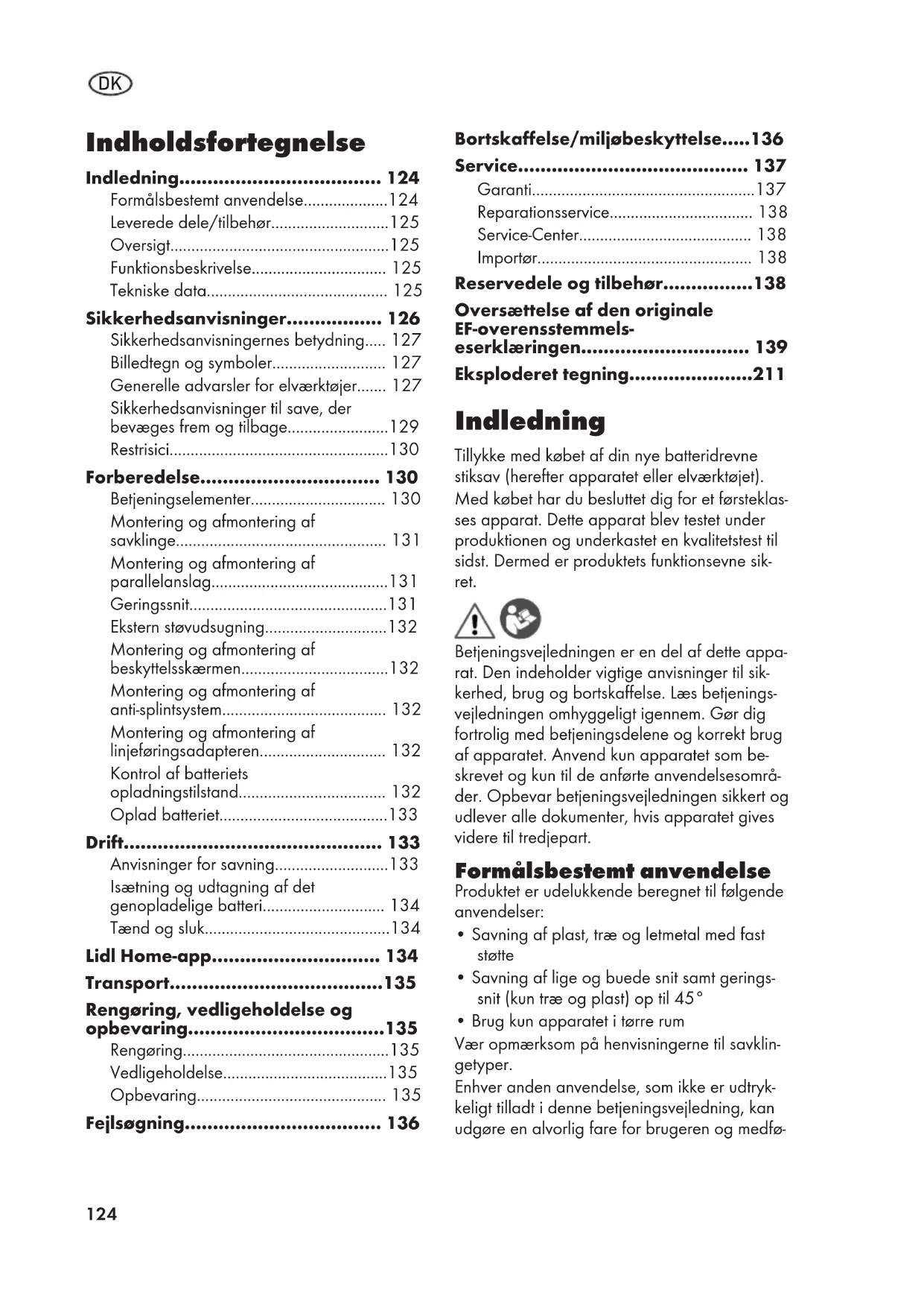 - Vi bortskaffer dine indsendte, defekte appa- rater gratis. Bortskaf genopladelige batterier efter de loka- le bestemmelser. Defekte eller brugte genop- ladelige batterier skal genanvendes i overens- stemmelse med 2006/66/EF. Aflever genop- ladelige batterier på et indsamlingssted, hvor de sendes til miljørigtig genanvendelse. Rådfør dig med dit lokale renovationsselskab eller vo- res service-center. Bortskaf det genopladelige batteri i afladet tilstand. Vi anbefaler, at poler- ne afdækkes med tape for at undgå en kortslut- ning. Åbn ikke det genopladelige batteri. DK137 Service Garanti Kære kunde! På dette apparat yder vi 5 års garanti fra købs- dato. Skulle der forekomme defekter på dette pro- dukt har du lovpligtige rettigheder mod sælge- ren af produktet. Disse lovpligtige rettigheder bliver ikke indskrænket af den efterfølgende an- førte garanti. Garantibetingelser Garantien træder i kraft med købsdatoen. Op- bevar den originale kassebon godt. Dette bilag kræves som dokumentation for købet. Skulle der indenfor fem år efter dette produkts købsdato optræde en materiale- eller fabrika- tionsfejl, bliver produktet – efter vores skøn – repareret eller ombyttet gratis. Denne garantiy- delse forudsætter, at det defekte apparat og købsbilaget (kassebon) indenfor den fem års frist bliver indsendt og at der vedlægges en kort skriftligt beskrivelse af defekten og hvornår den er optrådt. Hvis defekten er dækket af vores garanti, får du apparatet repareret eller ombyttet. Med re- parationen eller ombytningen begynder garan- tiperioden ikke forfra Garantiperiode og lovpligtige produktansvarskrav Garantiperioden bliver ikke forlænget af ga- rantien. Dette gælder også for ombyttede og reparerede dele. Eventuel allerede ved købet eksisterende skader og defekter skal meldes straks efter udpakningen. Efter udløb af garan- tiperioden forefaldende reparationer er om- kostningspligtige. Garantiens omfang Apparatet blev produceret meget omhyggeligt efter strenge kvalitetsretningslinjer og kontrolle- ret grundigt inden det forlod fabrikken. Garantiydelsen gælder for materiale- eller fa- brikationsfejl. Denne garanti gælder ikke for produktdele som er udsat for en normal neds- lidning og derfor kan anses som sliddele (fx savklinger) eller for beskadigelser på skrøbeli- ge dele (f.eks. kontakt, anti-splintsystem). Garantien bortfalder, hvis produktet bliver be- skadiget, ikke-formålsbestemt anvendt eller ik- ke vedligeholdt. For en korrekt brug af produk- tet skal alle i betjeningsvejledningen anførte anvisninger følges nøje. Anvendelsesformål og handlinger, som der frarådes eller advares imod i betjeningsvejledningen, skal ubetinget undgås. Produktet er kun beregnet til privat og ikke til erhvervsmæssig brug. Ved misbrug og usag- kyndig håndtering vold og ved indgreb, der ik- ke er foretaget på vores autoriserede service- sted, bortfalder garantien. Afvikling af et garantitilfælde For at garantere en hurtig behandling af dit an- liggende, bedes du følge følgende henvisnin- ger: