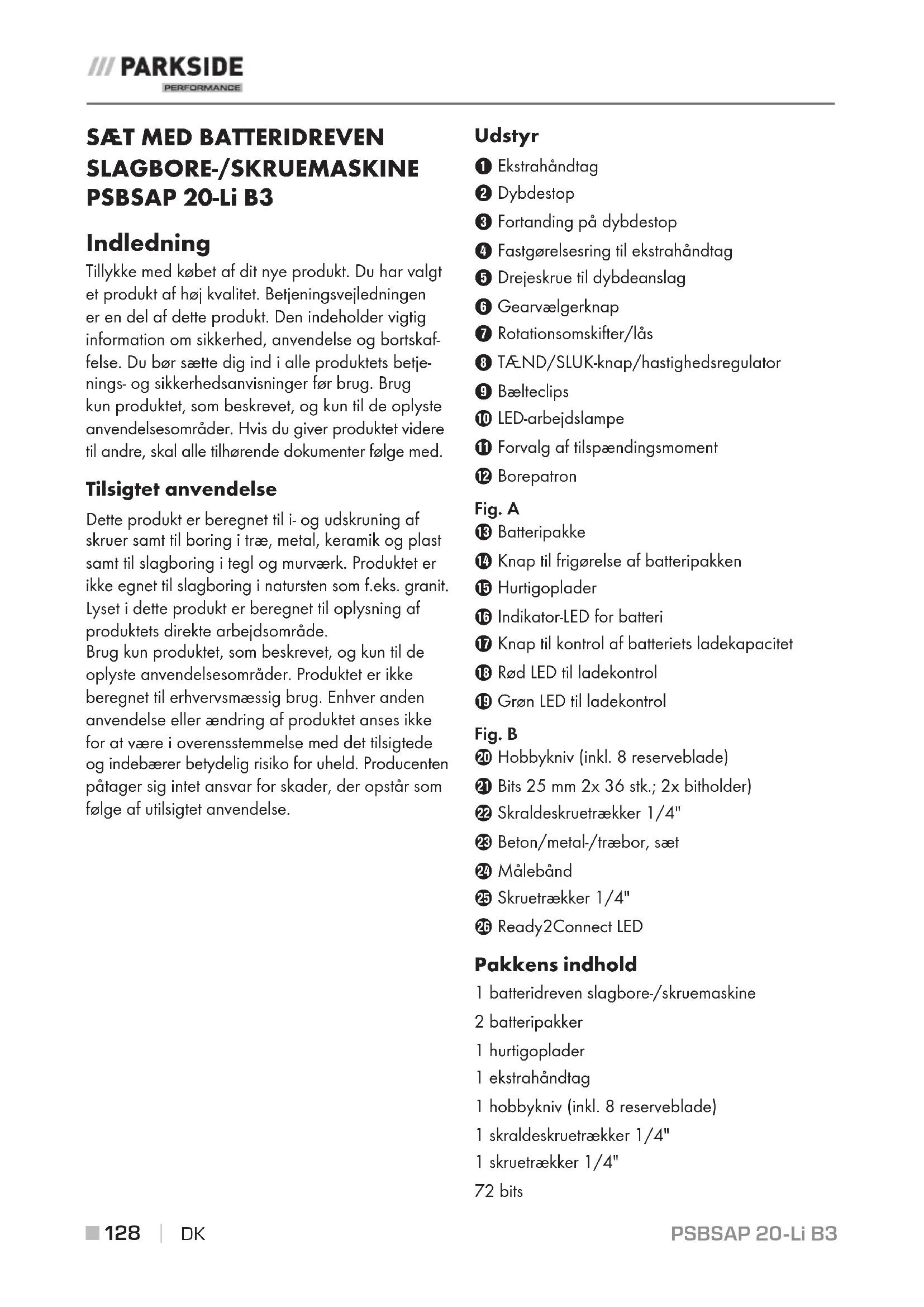 SLAGBORE-/SKRUEMASKINE PSBSAP 20-Li B3 Indledning Tillykke med købet af dit nye produkt. Du har valgt et produkt af høj kvalitet. Betjeningsvejledningen er en del af dette produkt. Den indeholder vigtig information om sikkerhed, anvendelse og bortskaf- felse. Du bør sætte dig ind i alle produktets betje- nings- og sikkerhedsanvisninger før brug. Brug kun produktet, som beskrevet, og kun til de oplyste anvendelsesområder. Hvis du giver produktet videre til andre, skal alle tilhørende dokumenter følge med. Tilsigtet anvendelse Dette produkt er beregnet til i- og udskruning af skruer samt til boring i træ, metal, keramik og plast samt til slagboring i tegl og murværk. Produktet er ikke egnet til slagboring i natursten som f.eks. granit. Lyset i dette produkt er beregnet til oplysning af produktets direkte arbejdsområde. Brug kun produktet, som beskrevet, og kun til de oplyste anvendelsesområder. Produktet er ikke beregnet til erhvervsmæssig brug. Enhver anden anvendelse eller ændring af produktet anses ikke for at være i overensstemmelse med det tilsigtede og indebærer betydelig risiko for uheld. Producenten påtager sig intet ansvar for skader, der opstår som følge af utilsigtet anvendelse. Udstyr 1 Ekstrahåndtag 2 Dybdestop 3 Fortanding på dybdestop 4 Fastgørelsesring til ekstrahåndtag 5 Drejeskrue til dybdeanslag 6 Gearvælgerknap 7 Rotationsomskifter/lås 8 TÆND/SLUK-knap/hastighedsregulator 9 Bælteclips 0 LED-arbejdslampe q Forvalg af tilspændingsmoment w Borepatron Fig. A e Batteripakke r Knap til frigørelse af batteripakken t Hurtigoplader z Indikator-LED for batteri u Knap til kontrol af batteriets ladekapacitet i Rød LED til ladekontrol o Grøn LED til ladekontrol Fig. B p Hobbykniv (inkl. 8 reserveblade) a Bits 25 mm 2x 36 stk.; 2x bitholder) s Skraldeskruetrækker 1/4" d Beton/metal-/træbor, sæt f Målebånd g Skruetrækker 1/4" h Ready2Connect LED Pakkens indhold 1 batteridreven slagbore-/skruemaskine 2 batteripakker 1 hurtigoplader 1 ekstrahåndtag 1 hobbykniv (inkl. 8 reserveblade) 1 skraldeskruetrækker 1/4" 1 skruetrækker 1/4" 72 bitsPSBSAP 20-Li B3 DK