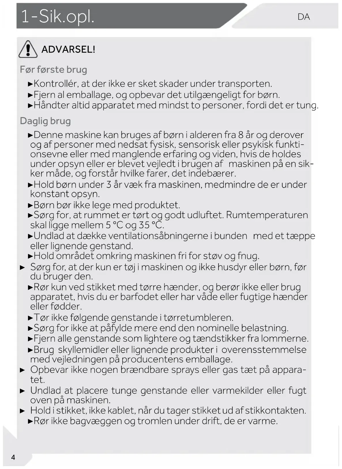 ADVARSEL! Før første brug ▶ Kontrollér, at der ikke er sket skader under transporten. ▶ Fjern al emballage, og opbevar det utilgængeligt for børn. ▶ Håndter altid apparatet med mindst to personer, fordi det er tung. Daglig brug ▶ Denne maskine kan bruges af børn i alderen fra 8 år og derover og af personer med nedsat fysisk, sensorisk eller psykisk funkti- onsevne eller med manglende erfaring og viden, hvis de holdes under opsyn eller er blevet vejledt i brugen af maskinen på en sik- ker måde, og forstår hvilke farer, det indebærer. ▶ Hold børn under 3 år væk fra maskinen, medmindre de er under konstant opsyn. ▶ Børn bør ikke lege med produktet. ▶ Sørg for, at rummet er tørt og godt udluftet. Rumtemperaturen skal ligge mellem 5 °C og 35 °C. ▶ Undlad at dække ventilationsåbningerne i bunden med et tæppe eller lignende genstand. ▶ Hold området omkring maskinen fri for støv og fnug. ▶ Sørg for, at der kun er tøj i maskinen og ikke husdyr eller børn, før du bruger den. ▶ Rør kun ved stikket med tørre hænder, og berør ikke eller brug apparatet, hvis du er barfodet eller har våde eller fugtige hænder eller fødder. ▶ Tør ikke følgende genstande i tørretumbleren. ▶ Sørg for ikke at påfylde mere end den nominelle belastning. ▶ Fjern alle genstande som lightere og tændstikker fra lommerne. ▶ Brug skyllemidler eller lignende produkter i overensstemmelse med vejledningen på producentens emballage. ▶ Opbevar ikke nogen brændbare sprays eller gas tæt på appara- tet. ▶ Undlad at placere tunge genstande eller varmekilder eller fugt oven på maskinen. ▶ Hold i stikket, ikke kablet, når du tager stikket ud af stikkontakten. ▶ Rør ikke bagvæggen og tromlen under drift, de er varme.DA 1-Sik.opl.