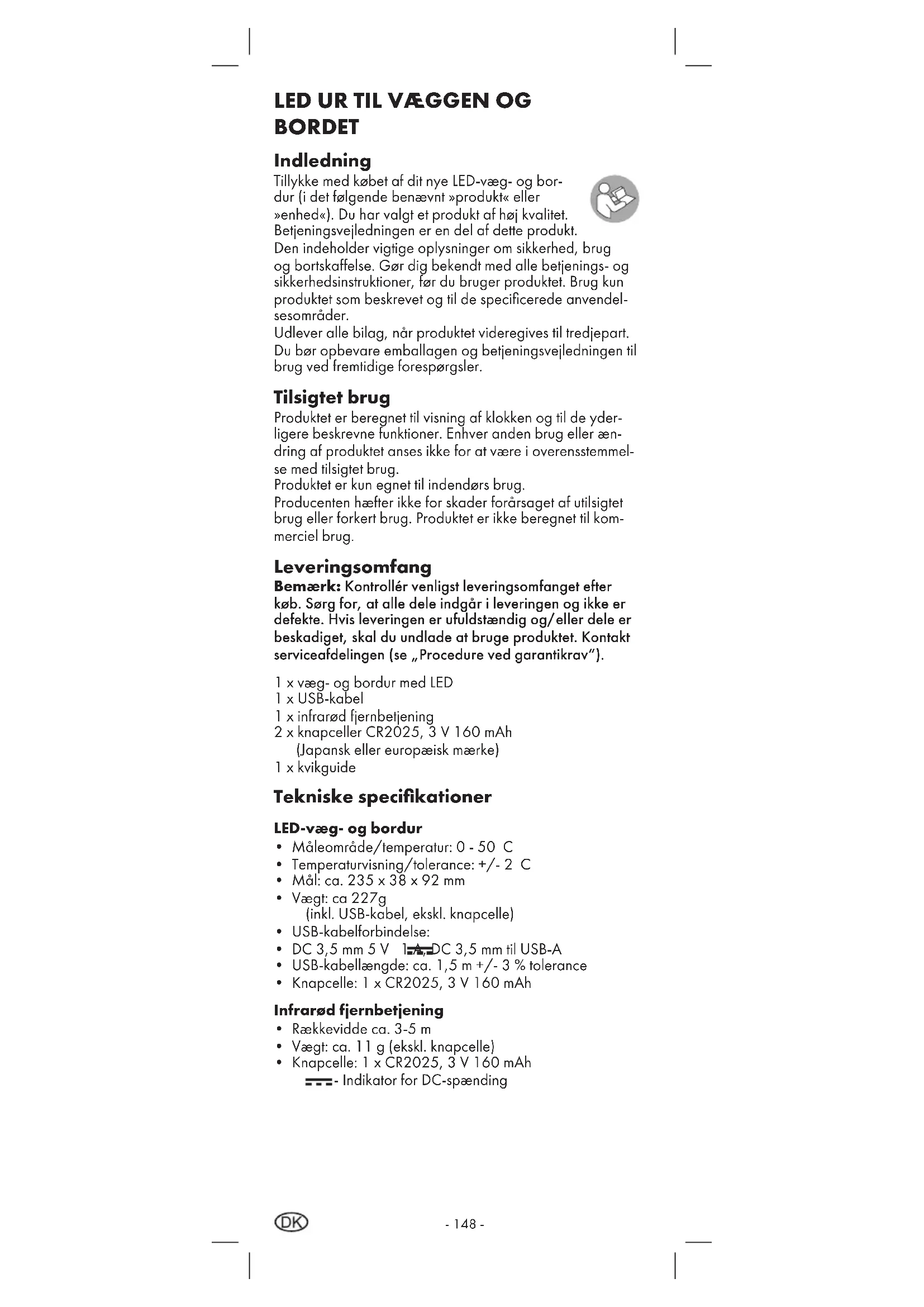 BORDET Indledning Tillykke med købet af dit nye LED-væg- og bor- dur (i det følgende benævnt »produkt« eller »enhed«). Du har valgt et produkt af høj kvalitet. Betjeningsvejledningen er en del af dette produkt. Den indeholder vigtige oplysninger om sikkerhed, brug og bortskaffelse. Gør dig bekendt med alle betjenings- og sikkerhedsinstruktioner, før du bruger produktet. Brug kun produktet som beskrevet og til de specificerede anvendel- sesområder. Udlever alle bilag, når produktet videregives til tredjepart. Du bør opbevare emballagen og betjeningsvejledningen til brug ved fremtidige forespørgsler. Tilsigtet brug Produktet er beregnet til visning af klokken og til de yder- ligere beskrevne funktioner. Enhver anden brug eller æn- dring af produktet anses ikke for at være i overensstemmel- se med tilsigtet brug. Produktet er kun egnet til indendørs brug. Producenten hæfter ikke for skader forårsaget af utilsigtet brug eller forkert brug. Produktet er ikke beregnet til kom- merciel brug. Leveringsomfang Bemærk: Kontrollér venligst leveringsomfanget efter køb Sørg for, at alle dele indgår i leveringen og ikke er defekte Hvis leveringen er ufuldstændig og/eller dele er beskadiget, skal du undlade at bruge produktet Kontakt serviceafdelingen (se „Procedure ved garantikrav“) 1 x væg- og bordur med LED 1 x USB-kabel 1 x infrarød fjernbetjening 2 x knapceller CR2025, 3 V 160 mAh (Japansk eller europæisk mærke) 1 x kvikguide Tekniske specifikationer LED-væg- og bordur