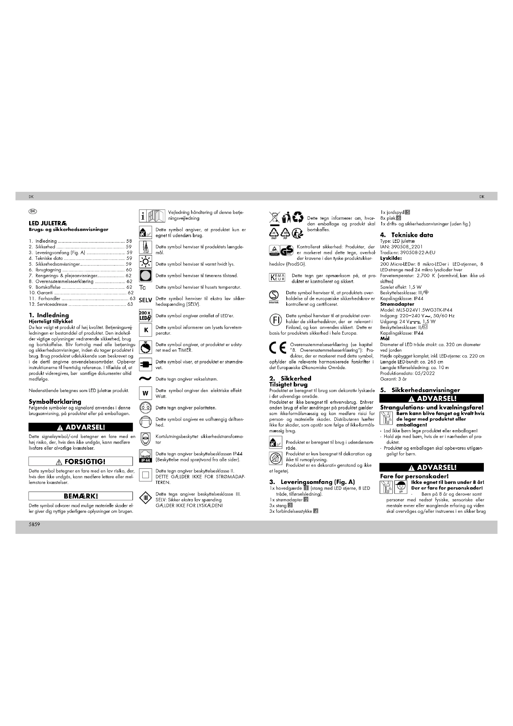 Type: LED juletræ IAN: 390508_2201 Tradix-nr: 390508-22-A-EU Lyskilde: 200 Micro-LEDer: 8 mikro-LEDer i LED-stjernen, 8 LED-strenge med 24 mikro lysdioder hver Farvetemperatur: 2.700 K (varmhvid, kan ikke ud- skiftes) Samlet effekt: 1,5 W Beskyttelsesklasse: III/ Kapslingsklasse: IP44 Strømadapter Model: MLS-D24V1.5WG3TK-IP44 Indgang: 220−240 V , 50/60 Hz Udgang: 24 V , 1,5 W Beskyttelsesklasse: II/ Kapslingsklasse: IP44 Mål Diameter af LED tråde strakt: ca. 320 cm diameter ved jorden Højde opbygget komplet, inkl. LED-stjerne: ca. 220 cm Længde LED-bundt: ca. 265 cm Længde tilførselsledning: ca. 10 m Produktionsdato: 05/2022 Garanti: 3 år