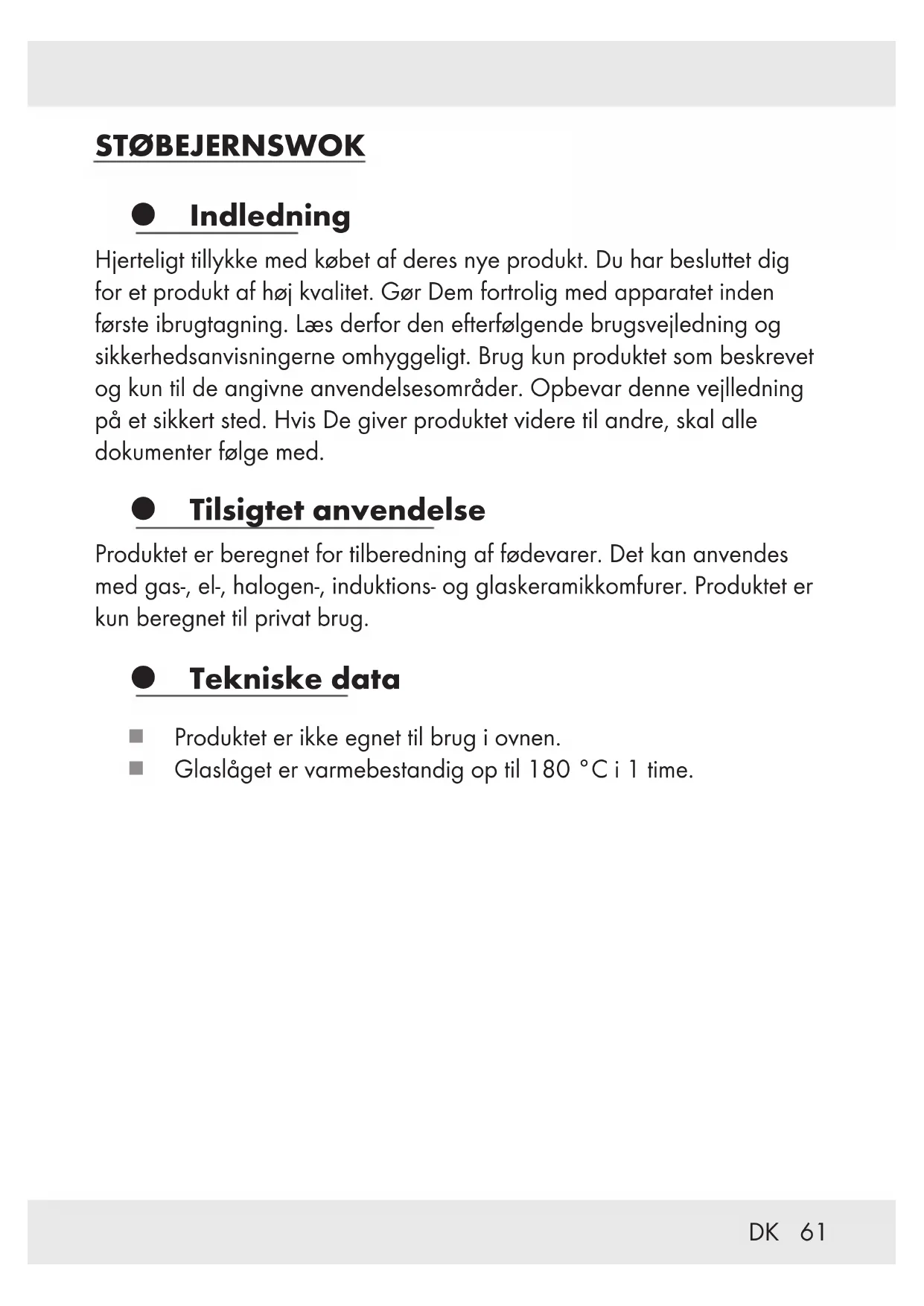 Vær opmærksom på, at håndtagene kan blive varme under madlavningen. Anvend grydelapper eller grillhandsker som beskyttelse. Et varmt produkt skal altid stilles på et varmebestandigt underlag og ikke på en ubeskyttet arbejdsflade. Ved madlavning og opvarmning af fedtstoffer er det vigtigt, at produktet ikke lades ude af syne. Fedt kan hurtigt bliver overophedet og antænde. Hvis fedtstoffet antænder, må det aldrig slukkes med vand! Ilden slukkes med et låg eller et tykt tæppe. Produktet må ikke opvarmes i tom tilstand. I modsat fald kan det føre til afsprængning af emalje. For ikke at beskadige emaljeoverfladen, må der kun anvendes køkkenredskaber af varmebestandigt plast eller træ. Madvarer må ikke udskæres direkte i produktet. Læg ikke dryppende vådt kød i varmt fedt. Hvis der sprøjter fedt på en varm kogeplade kan der nemt opstå en brand. ADVARSEL! Løft altid produktet når der laves mad på hærdede glasflader (fx glaskeramisk-, halogen- og induktionskogeplader). Produktet må ALDRIG skubbes hen over sådanne overflader, idet produktets bund og kogeplade. Gasflammer skal altid tilpasses produktets bund og må ALDRIG brænde op langs siderne.63DK Produktet må ikke anvendes i mikrobølgeovn. Produktet må IKKE anvendes i en ovn! Produktet er ikke egnet til opvaskemaskine. OBS! Glaslåget er skrøbeligt/ikke stødsikkert! Anvend ikke låget hvis håndtaget sidder løst. Efterspænd evt. dækslets skruer.
