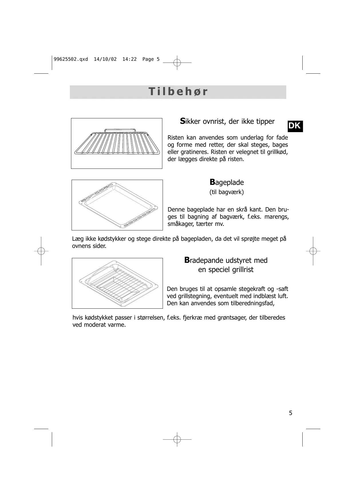 Bageplade (til bagværk) Denne bageplade har en skrå kant. Den bruges til bagning af bagværk, f.eks. marengs, småkager, tærter mv. Læg ikke kødstykker og stege direkte på bagepladen, da det vil sprøjte meget på ovnens sider.