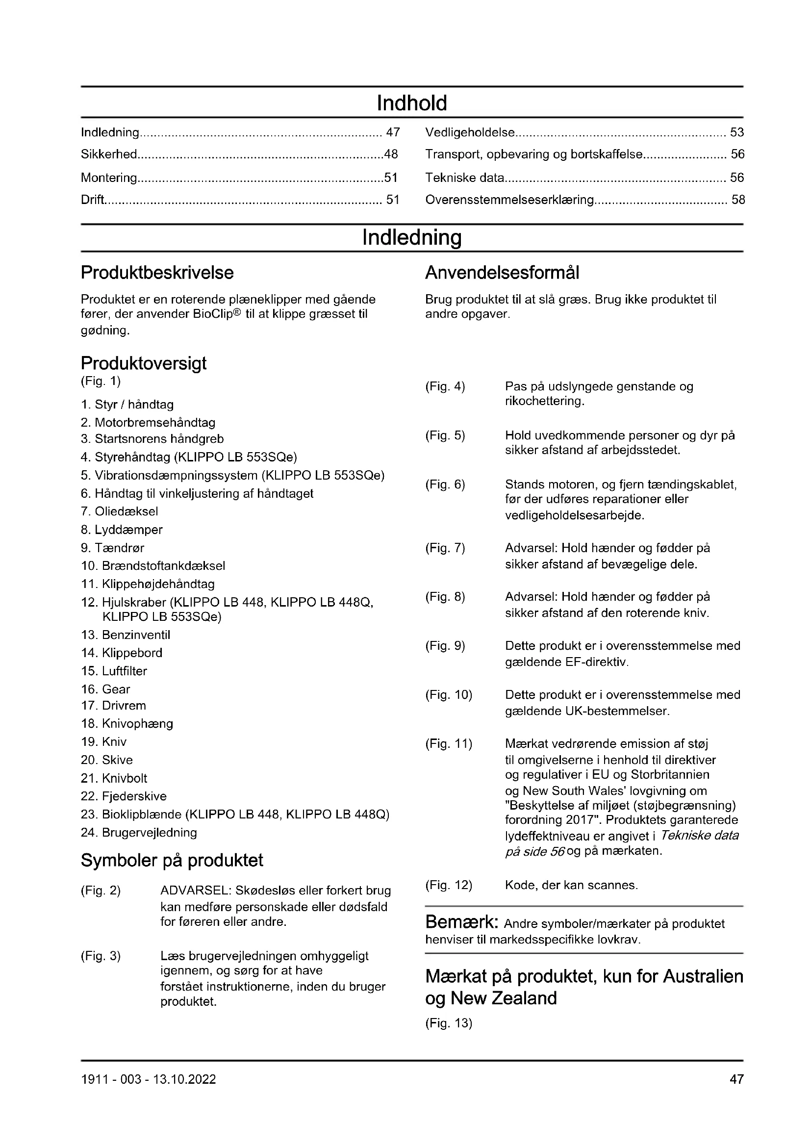 Symboler på produktet (Fig. 2) ADVARSEL: Skødesløs eller forkert brug kan medføre personskade eller dødsfald for føreren eller andre. (Fig. 3) Læs brugervejledningen omhyggeligt igennem, og sørg for at have forstået instruktionerne, inden du bruger produktet. (Fig. 4) Pas på udslyngede genstande og rikochettering. (Fig. 5) Hold uvedkommende personer og dyr på sikker afstand af arbejdsstedet. (Fig. 6) Stands motoren, og fjern tændingskablet, før der udføres reparationer eller vedligeholdelsesarbejde. (Fig. 7) Advarsel: Hold hænder og fødder på sikker afstand af bevægelige dele. (Fig. 8) Advarsel: Hold hænder og fødder på sikker afstand af den roterende kniv. (Fig. 9) Dette produkt er i overensstemmelse med gældende EF-direktiv. (Fig. 10) Dette produkt er i overensstemmelse med gældende UK-bestemmelser. (Fig. 11) Mærkat vedrørende emission af støj til omgivelserne i henhold til direktiver og regulativer i EU og Storbritannien og New South Wales' lovgivning om "Beskyttelse af miljøet (støjbegrænsning) forordning 2017". Produktets garanterede lydeffektniveau er angivet i Tekniske data på side 56 og på mærkaten. (Fig. 12) Kode, der kan scannes. Bemærk: Andre symboler/mærkater på produktet henviser til markedsspecifikke lovkrav. Mærkat på produktet, kun for Australien og New Zealand (Fig. 13) 1911 - 003 - 13.10.2022 47Hold hænder og fødder på sikker afstand af den roterende klinge. Euro V-emissioner ADVARSEL: Ved manipulation af motoren bortfalder EU-typegodkendelsen af dette produkt. Produktansvar Som nævnt i produktansvarsbestemmelserne hæfter vi ikke for skader forårsaget af vores produkt, hvis: