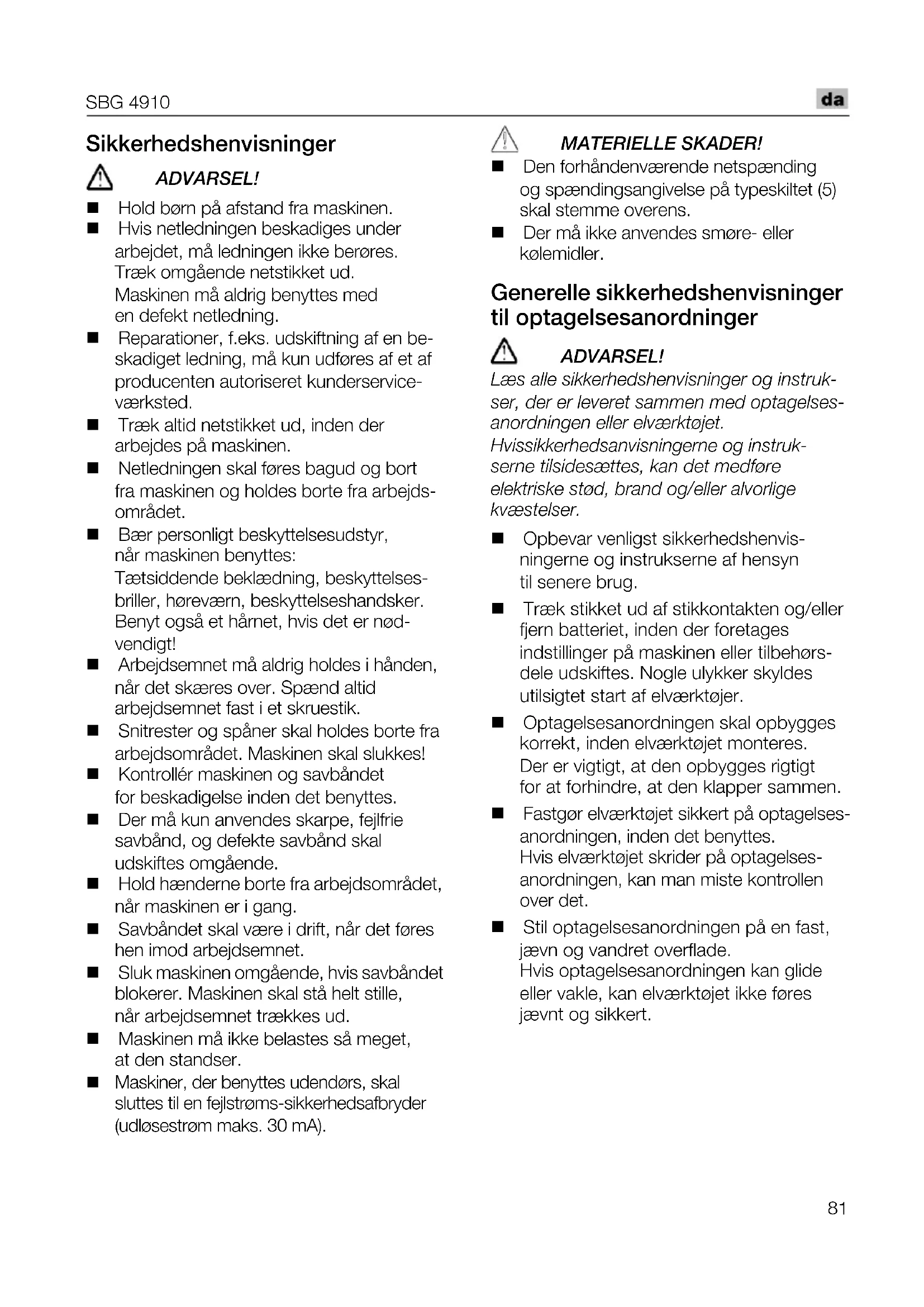 Maskiner, der benyttes udendørs, skal sluttes til en fejlstrøms-sikkerhedsafbryder (udløsestrøm maks. 30 mA). j^qbofbiib=ph^abo> Den forhåndenværende netspænding og spændingsangivelse på typeskiltet (5) skal stemme overens. Der må ikke anvendes smøre- eller kølemidler. Generelle sikkerhedshenvisninger til optagelsesanordninger ^as^opbi> i‹ë=~ääÉ=ëáââÉêÜÉÇëÜÉåîáëåáåÖÉê=çÖ=áåëíêìâJ ëÉêI=ÇÉê=Éê=äÉîÉêÉí=ë~ããÉå=ãÉÇ=çéí~ÖÉäëÉëJ ~åçêÇåáåÖÉå=ÉääÉê=Éäî‹êâí›àÉíK= eîáë ëáââÉêÜÉÇë~åîáëåáåÖÉêåÉ=çÖ=áåëíêìâJ ëÉêåÉ=íáäëáÇÉë‹ííÉëI=â~å=ÇÉí=ãÉÇÑ›êÉ= ÉäÉâíêáëâÉ=ëí›ÇI=Äê~åÇ=çÖLÉääÉê=~äîçêäáÖÉ= âî‹ëíÉäëÉêK Opbevar venligst sikkerhedshenvis- ningerne og instrukserne af hensyn til senere brug. Træk stikket ud af stikkontakten og/eller fjern batteriet, inden der foretages indstillinger på maskinen eller tilbehørs- dele udskiftes. Nogle ulykker skyldes utilsigtet start af elværktøjer. Optagelsesanordningen skal opbygges korrekt, inden elværktøjet monteres. Der er vigtigt, at den opbygges rigtigt for at forhindre, at den klapper sammen. Fastgør elværktøjet sikkert på optagelses- anordningen, inden det benyttes. Hvis elværktøjet skrider på optagelses- anordningen, kan man miste kontrollen over det. Stil optagelsesanordningen på en fast, jævn og vandret overflade. Hvis optagelsesanordningen kan glide eller vakle, kan elværktøjet ikke føres jævnt og sikkert.SBG 4910