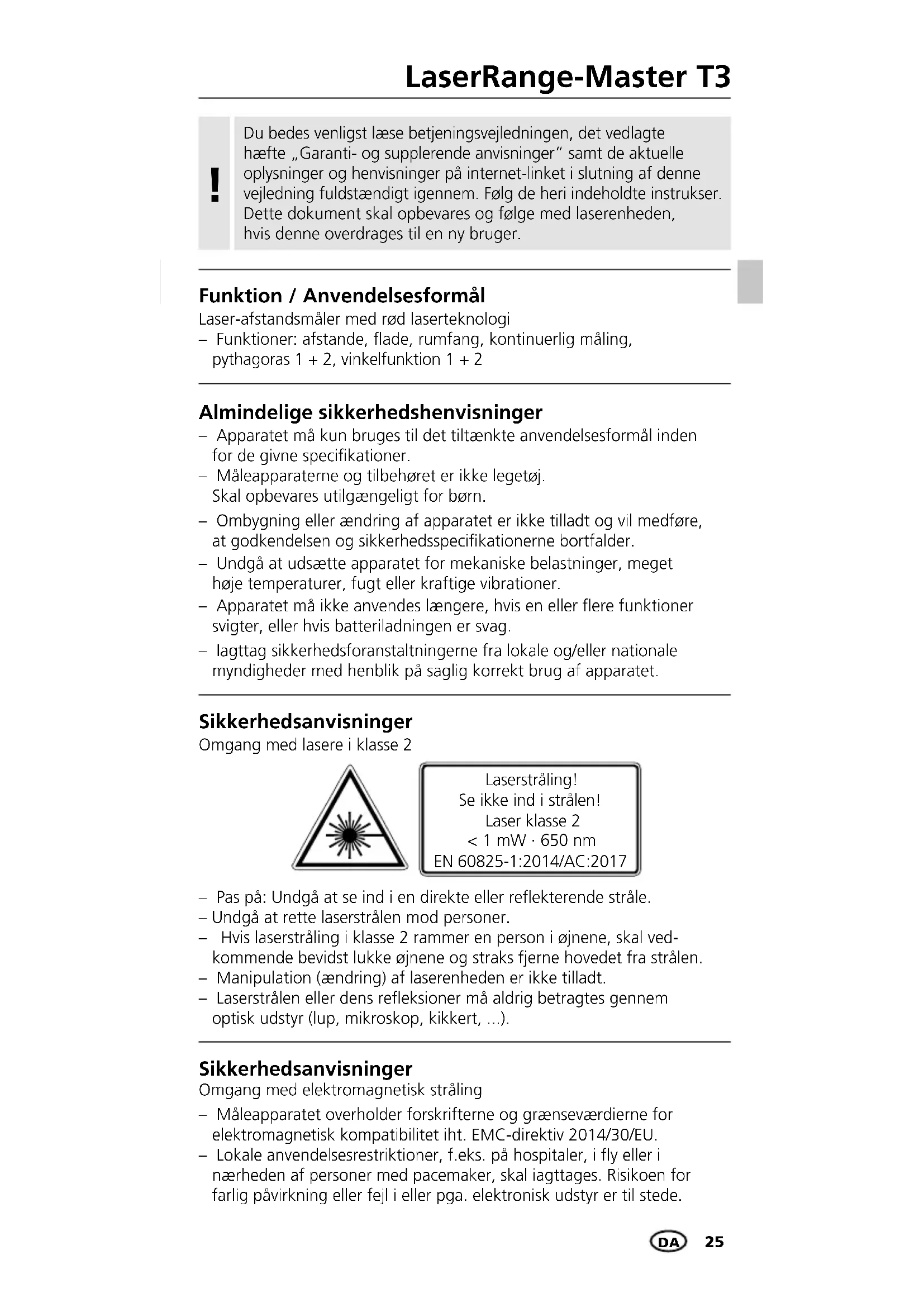 Almindelige sikkerhedshenvisninger – Apparatet må kun bruges til det tiltænkte anvendelsesformål inden for de givne specikationer. – Måleapparaterne og tilbehøret er ikke legetøj. Skal opbevares utilgængeligt for børn. – Ombygning eller ændring af apparatet er ikke tilladt og vil medføre, at godkendelsen og sikkerhedsspecikationerne bortfalder. – Undgå at udsætte apparatet for mekaniske belastninger, meget høje temperaturer, fugt eller kraftige vibrationer. – Apparatet må ikke anvendes længere, hvis en eller ere funktioner svigter, eller hvis batteriladningen er svag. – Iagttag sikkerhedsforanstaltningerne fra lokale og/eller nationale myndigheder med henblik på saglig korrekt brug af apparatet. – Pas på: Undgå at se ind i en direkte eller reekterende stråle. – Undgå at rette laserstrålen mod personer. – Hvis laserstråling i klasse 2 rammer en person i øjnene, skal ved- kommende bevidst lukke øjnene og straks fjerne hovedet fra strålen. – Manipulation (ændring) af laserenheden er ikke tilladt. – Laserstrålen eller dens reeksioner må aldrig betragtes gennem optisk udstyr (lup, mikroskop, kikkert, ...). Sikkerhedsanvisninger Omgang med lasere i klasse 2 Laserstråling! Se ikke ind i strålen! Laser klasse 2 < 1 mW · 650 nm EN 60825-1:2014/AC:2017 Sikkerhedsanvisninger Omgang med elektromagnetisk stråling – Måleapparatet overholder forskrifterne og grænseværdierne for elektromagnetisk kompatibilitet iht. EMC-direktiv 2014/30/EU. – Lokale anvendelsesrestriktioner, f.eks. på hospitaler, i y eller i nærheden af personer med pacemaker, skal iagttages. Risikoen for farlig påvirkning eller fejl i eller pga. elektronisk udstyr er til stede. Du bedes venligst læse betjeningsvejledningen, det vedlagte hæfte „Garanti- og supplerende anvisninger“ samt de aktuelle oplysninger og henvisninger på internet-linket i slutning af denne vejledning fuldstændigt igennem. Følg de heri indeholdte instrukser. Dette dokument skal opbevares og følge med laserenheden, hvis denne overdrages til en ny bruger.