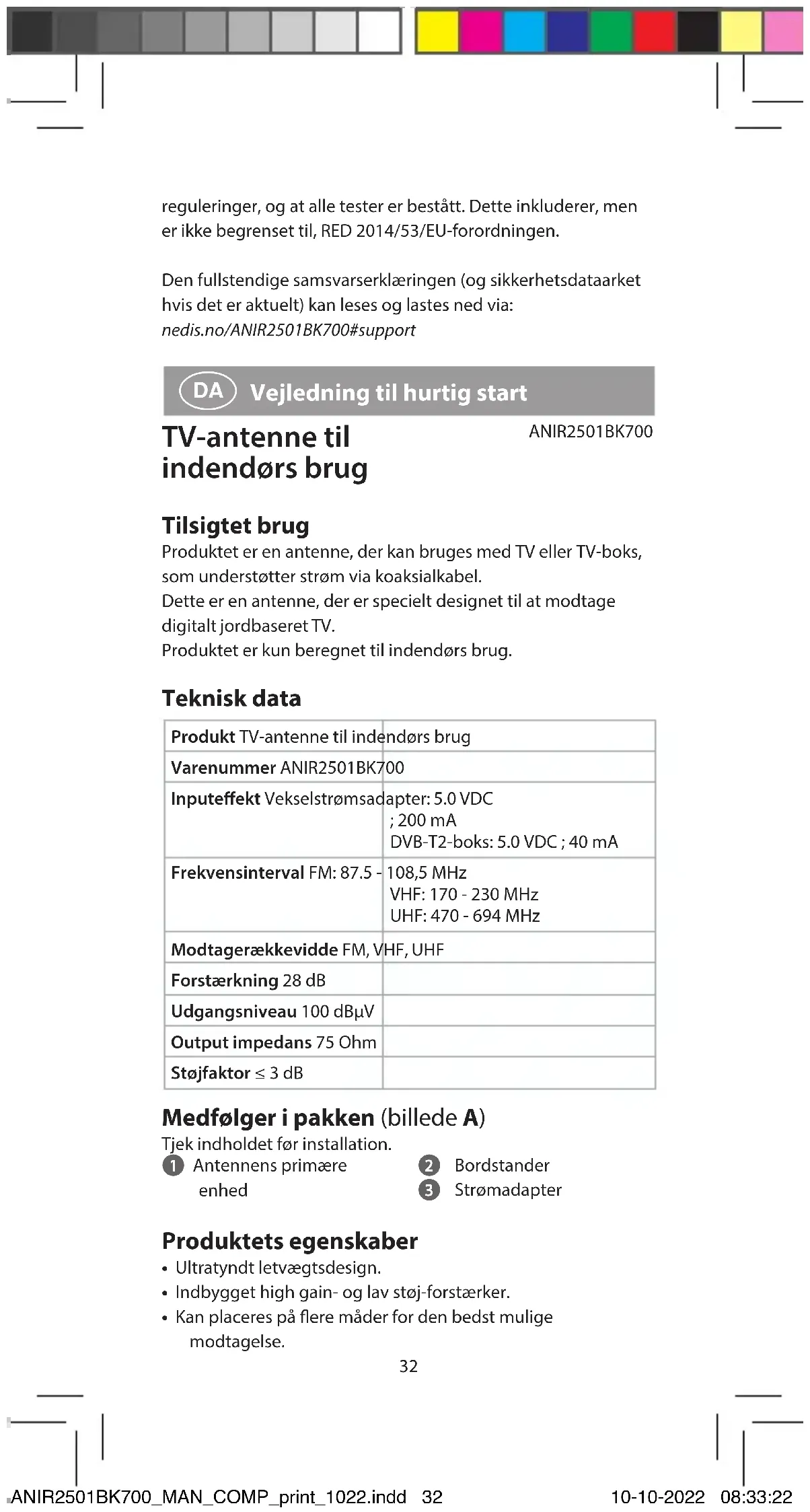 Vejledning til hurtig start TV-antenne til indendørs brug ANIR2501BK700 Tilsigtet brug Produktet er en antenne, der kan bruges med TV eller TV-boks, som understøtter strøm via koaksialkabel. Dette er en antenne, der er specielt designet til at modtage digitalt jordbaseret TV. Produktet er kun beregnet til indendørs brug. Teknisk data Produkt TV-antenne til indendørs brug Varenummer ANIR2501BK700 Inputeekt Vekselstrømsadapter: 5.0 VDC ; 200 mA DVB-T2-boks: 5.0 VDC ; 40 mA Frekvensinterval FM: 87.5 - 108,5 MHz VHF: 170 - 230 MHz UHF: 470 - 694 MHz Modtagerækkevidde FM, VHF, UHF Forstærkning 28 dB Udgangsniveau 100 dBµV Output impedans 75 Ohm Støjfaktor ≤ 3 dB Medfølger i pakken (billede A) Tjek indholdet før installation. 1 Antennens primære enhed 2 Bordstander 3 Strømadapter Produktets egenskaber