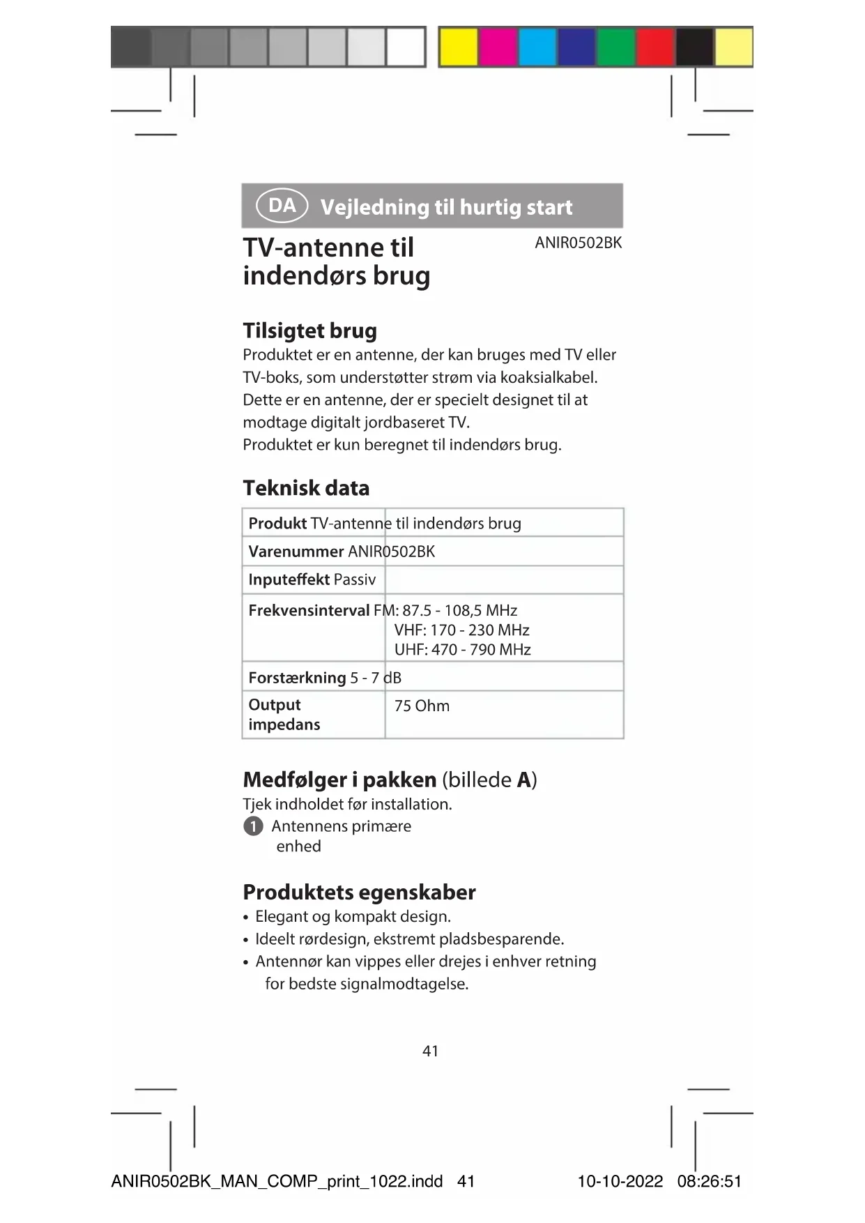 Når installationen er færdig, kan du bruge din boks til at kontrollere signalstyrken og -kvaliteten. Hvis du ikke kan få et stabilt billede, skal du ytte antennen til en bedre modtageposition. Når du nder den bedste position, skal du ksere den. ANIR0502BK_MAN_COMP_print_1022.indd 43ANIR0502BK_MAN_COMP_print_1022.indd 43 10-10-2022 08:26:5110-10-2022 08:26:5144 Bortskaelse Dette symbol betyder, at dette produkt ikke skal bortskaes sammen med andet husholdningsaald inden for EU. For at forebygge mulig skade på miljøet eller menneskelig sundhed ved ukontrolleret bortskaelse af aald er du ansvarlig for at genbruge det, så det kan fremme bæredygtigt genbrug af råmaterialer. For at returnere dit brugte produkt kan du bruge det almindelige returnerings- og indsamlingssystem eller kontakte den butik, hvor produktet blev købt. Der kan dette produkt genbruges til gavn for miljøet.