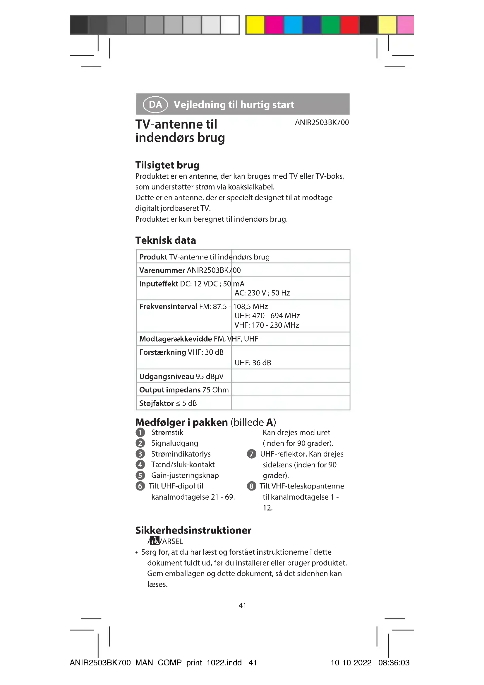 Vejledning til hurtig start TV-antenne til indendørs brug ANIR2503BK700 Tilsigtet brug Produktet er en antenne, der kan bruges med TV eller TV-boks, som understøtter strøm via koaksialkabel.Dette er en antenne, der er specielt designet til at modtage digitalt jordbaseret TV.Produktet er kun beregnet til indendørs brug. Teknisk data Produkt TV-antenne til indendørs brugVarenummer ANIR2503BK700Inputeekt DC: 12 VDC ; 50 mAAC: 230 V ; 50 HzFrekvensinterval FM: 87.5 - 108,5 MHzUHF: 470 - 694 MHzVHF: 170 - 230 MHzModtagerækkevidde FM, VHF, UHFForstærkning VHF: 30 dBUHF: 36 dBUdgangsniveau 95 dBµVOutput impedans 75 OhmStøjfaktor ≤ 5 dB Medfølger i pakken (billede A) 1 Strømstik 2 Signaludgang 3 Strømindikatorlys 4 Tænd/sluk-kontakt 5 Gain-justeringsknap 6 Tilt UHF-dipol til kanalmodtagelse 21 - 69. Kan drejes mod uret (inden for 90 grader). 7 UHF-reektor. Kan drejes sidelæns (inden for 90 grader). 8 Tilt VHF-teleskopantenne til kanalmodtagelse 1 -