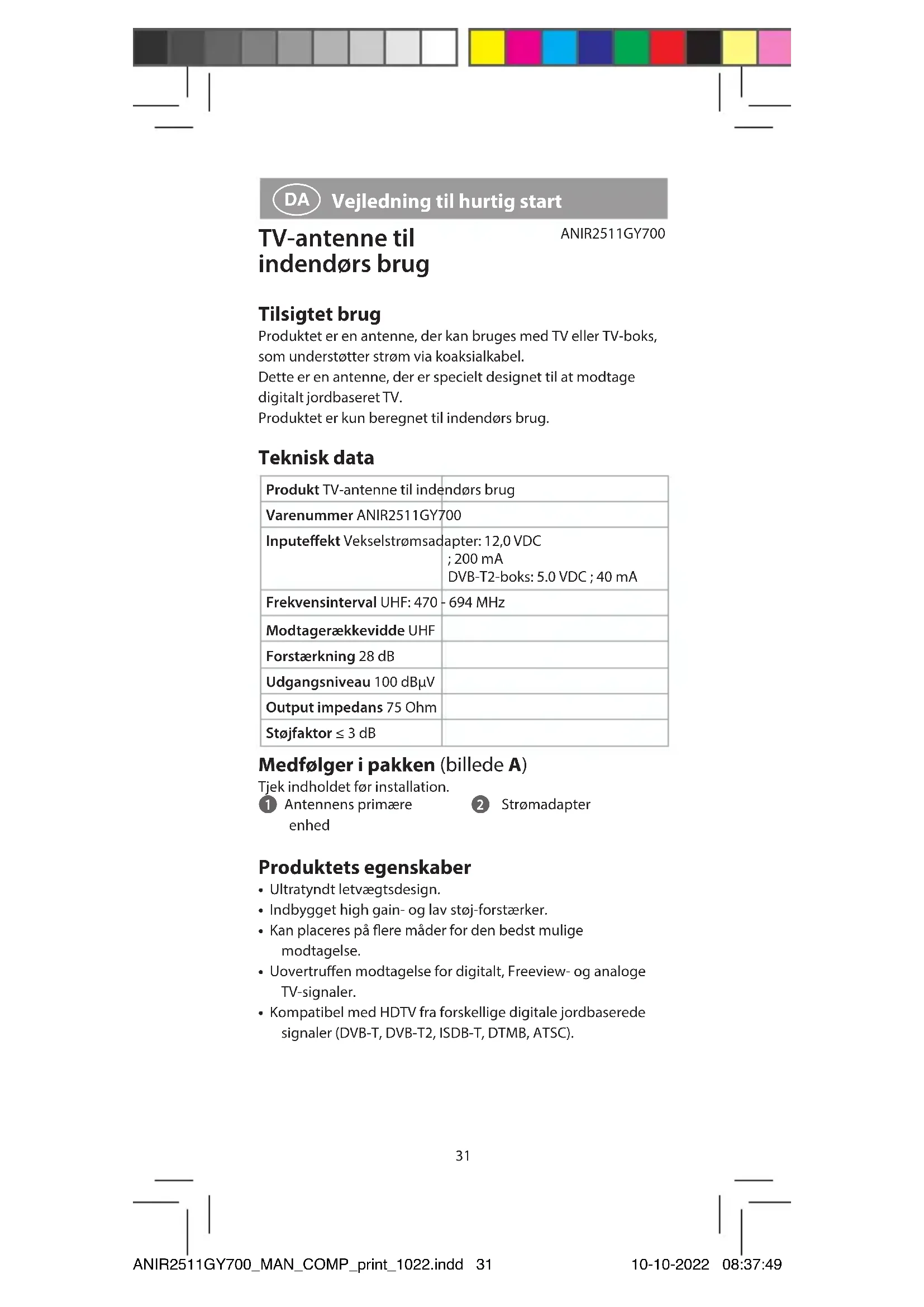 Vejledning til hurtig start TV-antenne til indendørs brug ANIR2511GY700 Tilsigtet brug Produktet er en antenne, der kan bruges med TV eller TV-boks, som understøtter strøm via koaksialkabel. Dette er en antenne, der er specielt designet til at modtage digitalt jordbaseret TV. Produktet er kun beregnet til indendørs brug. Teknisk data Produkt TV-antenne til indendørs brug Varenummer ANIR2511GY700 Inputeekt Vekselstrømsadapter: 12,0 VDC ; 200 mA DVB-T2-boks: 5.0 VDC ; 40 mA Frekvensinterval UHF: 470 - 694 MHz Modtagerækkevidde UHF Forstærkning 28 dB Udgangsniveau 100 dBµV Output impedans 75 Ohm Støjfaktor ≤ 3 dB Medfølger i pakken (billede A) Tjek indholdet før installation. 1 Antennens primære enhed 2 Strømadapter Produktets egenskaber