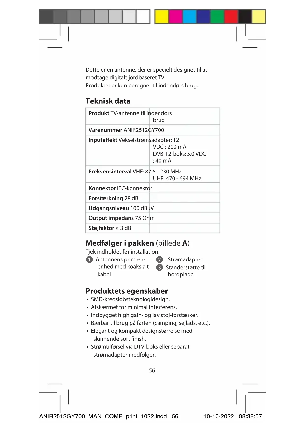 Vejledning til hurtig start TV-antenne til indendørs brug ANIR2512GY700 Tilsigtet brug Produktet er en antenne, der kan bruges med TV eller TV-boks, som understøtter strøm via koaksialkabel. ANIR2512GY700_MAN_COMP_print_1022.indd 55ANIR2512GY700_MAN_COMP_print_1022.indd 55 10-10-2022 08:38:5710-10-2022 08:38:5756 Dette er en antenne, der er specielt designet til at modtage digitalt jordbaseret TV. Produktet er kun beregnet til indendørs brug. Teknisk data Produkt TV-antenne til indendørs brug Varenummer ANIR2512GY700 Inputeekt Vekselstrømsadapter: 12 VDC ; 200 mA DVB-T2-boks: 5.0 VDC ; 40 mA Frekvensinterval VHF: 87.5 - 230 MHz UHF: 470 - 694 MHz Konnektor IEC-konnektor Forstærkning 28 dB Udgangsniveau 100 dBµV Output impedans 75 Ohm Støjfaktor ≤ 3 dB Medfølger i pakken (billede A) Tjek indholdet før installation. 1 Antennens primære enhed med koaksialt kabel 2 Strømadapter 3 Standerstøtte til bordplade Produktets egenskaber