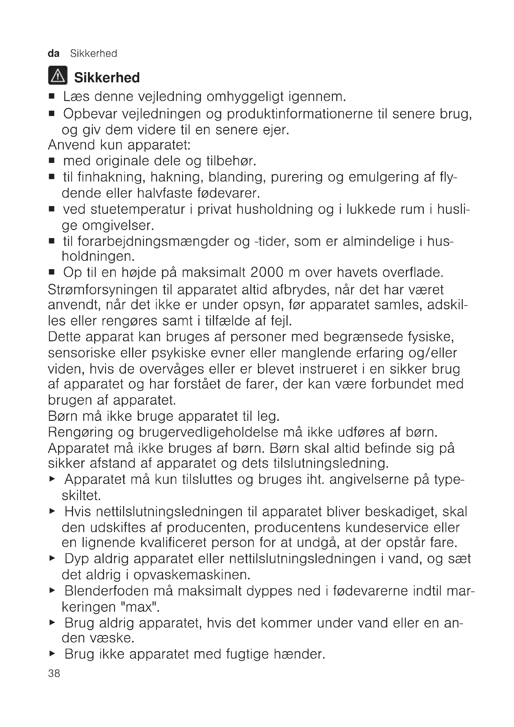 Sikkerhed ¡ Læs denne vejledning omhyggeligt igennem. ¡ Opbevar vejledningen og produktinformationerne til senere brug, og giv dem videre til en senere ejer. Anvend kun apparatet: ¡ med originale dele og tilbehør. ¡ til finhakning, hakning, blanding, purering og emulgering af fly- dende eller halvfaste fødevarer. ¡ ved stuetemperatur i privat husholdning og i lukkede rum i husli- ge omgivelser. ¡ til forarbejdningsmængder og -tider, som er almindelige i hus- holdningen. ¡ Op til en højde på maksimalt 2000m over havets overflade. Strømforsyningen til apparatet altid afbrydes, når det har været anvendt, når det ikke er under opsyn, før apparatet samles, adskil- les eller rengøres samt i tilfælde af fejl. Dette apparat kan bruges af personer med begrænsede fysiske, sensoriske eller psykiske evner eller manglende erfaring og/eller viden, hvis de overvåges eller er blevet instrueret i en sikker brug af apparatet og har forstået de farer, der kan være forbundet med brugen af apparatet. Børn må ikke bruge apparatet til leg. Rengøring og brugervedligeholdelse må ikke udføres af børn. Apparatet må ikke bruges af børn. Børn skal altid befinde sig på sikker afstand af apparatet og dets tilslutningsledning. ▶ Apparatet må kun tilsluttes og bruges iht. angivelserne på type- skiltet. ▶ Hvis nettilslutningsledningen til apparatet bliver beskadiget, skal den udskiftes af producenten, producentens kundeservice eller en lignende kvalificeret person for at undgå, at der opstår fare. ▶ Dyp aldrig apparatet eller nettilslutningsledningen i vand, og sæt det aldrig i opvaskemaskinen. ▶ Blenderfoden må maksimalt dyppes ned i fødevarerne indtil mar- keringen "max". ▶ Brug aldrig apparatet, hvis det kommer under vand eller en an- den væske. ▶ Brug ikke apparatet med fugtige hænder.Forhindring af materielle skader da