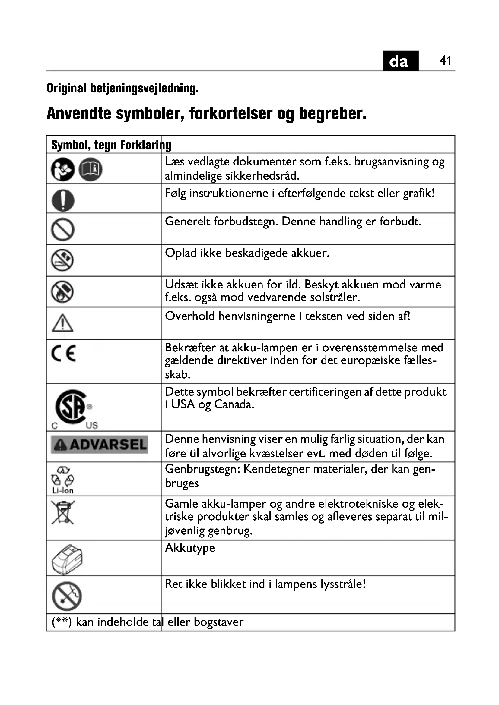 Original betjeningsvejledning. Anvendte symboler, forkortelser og begreber. Symbol, tegn Forklaring Læs vedlagte dokumenter som f.eks. brugsanvisning og almindelige sikkerhedsråd. Følg instruktionerne i efterfølgende tekst eller grafik! Generelt forbudstegn. Denne handling er forbudt. Oplad ikke beskadigede akkuer. Udsæt ikke akkuen for ild. Beskyt akkuen mod varme f.eks. også mod vedvarende solstråler. Overhold henvisningerne i teksten ved siden af! Bekræfter at akku-lampen er i overensstemmelse med gældende direktiver inden for det europæiske fælles- skab. Dette symbol bekræfter certificeringen af dette produkt i USA og Canada. Denne henvisning viser en mulig farlig situation, der kan føre til alvorlige kvæstelser evt. med døden til følge. Genbrugstegn: Kendetegner materialer, der kan gen- bruges Gamle akku-lamper og andre elektrotekniske og elek- triske produkter skal samles og afleveres separat til mil- jøvenlig genbrug. Akkutype Ret ikke blikket ind i lampens lysstråle! (**) kan indeholde tal eller bogstaver OBJ_BUCH-0000000215-001.book Page 41 Friday, August 7, 2015 9:31 AM42