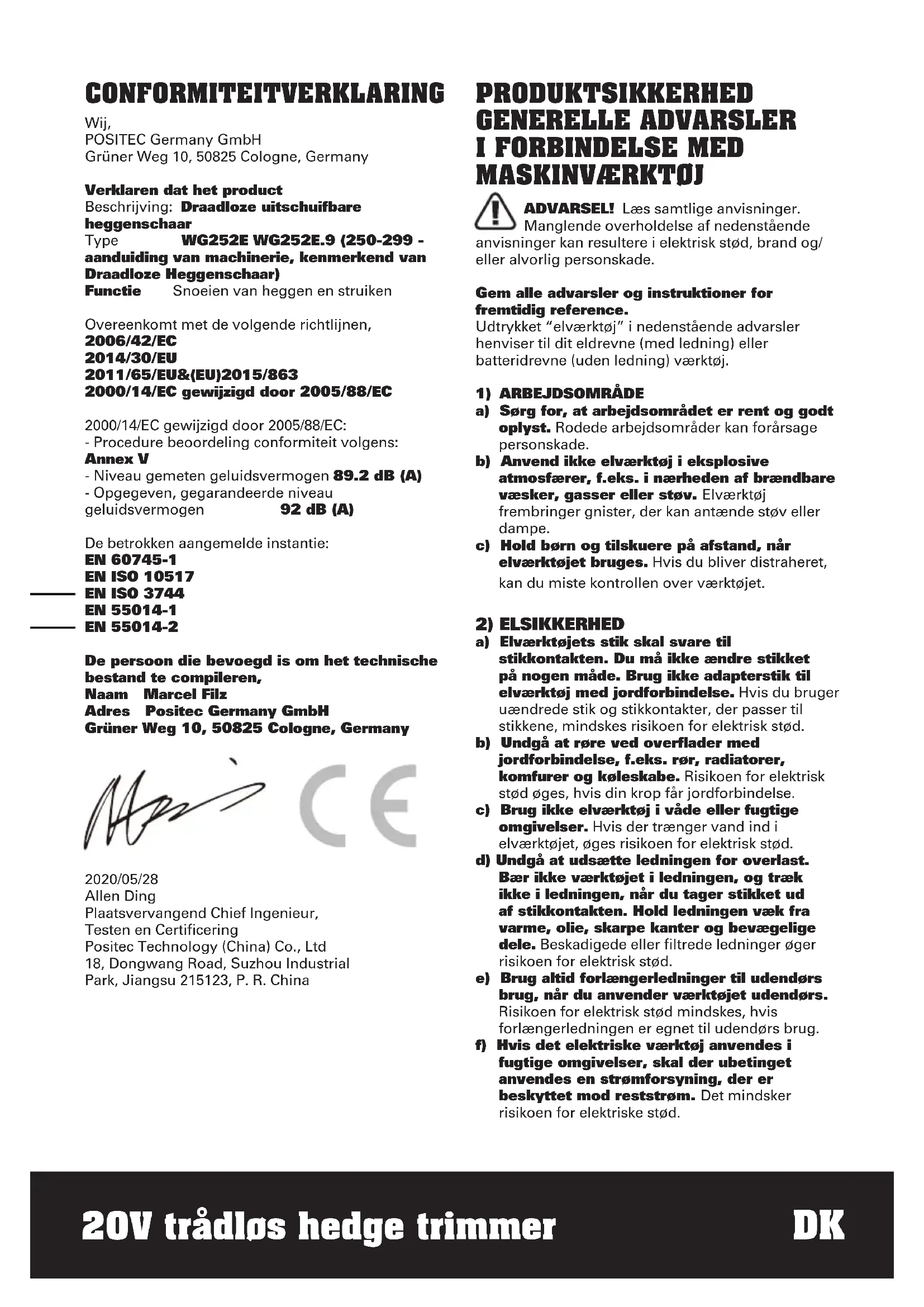 a) DENNE HEDGE TRIMMER KAN FORVÆRE ALVORLIGE SKADER. Læs instruktionerne omhyggeligt for korrekt at håndtere, forberede, vedligeholde, starte og stoppe hæktrimmeren. Vær bekendt med korrekt brug af alle betjeningselementer og hækklippere. b) Tillad aldrig børn at bruge en hækklipper. c) Pas på luftledninger. d) Undgå at arbejde i nærheden af områder, især børn. e) Klædt ordentligt! Bær ikke løst tøj eller smykker, da det kan klemme bevægelige dele. Robuste handsker, skridsikre sko og sikkerhedsbriller anbefales. f) Hvis skæremekanismen støder på fremmede genstande, eller hvis hæktrimmeren begynder at udsende enhver unormal lyd eller vibration, skal du slukke for strømmen og stoppe hæktrimmeren. Udfør følgende trin: kontroller for skader; inspicér og spænd alle løse dele; udskift eller reparér beskadigede dele med dele af samme specifikation.