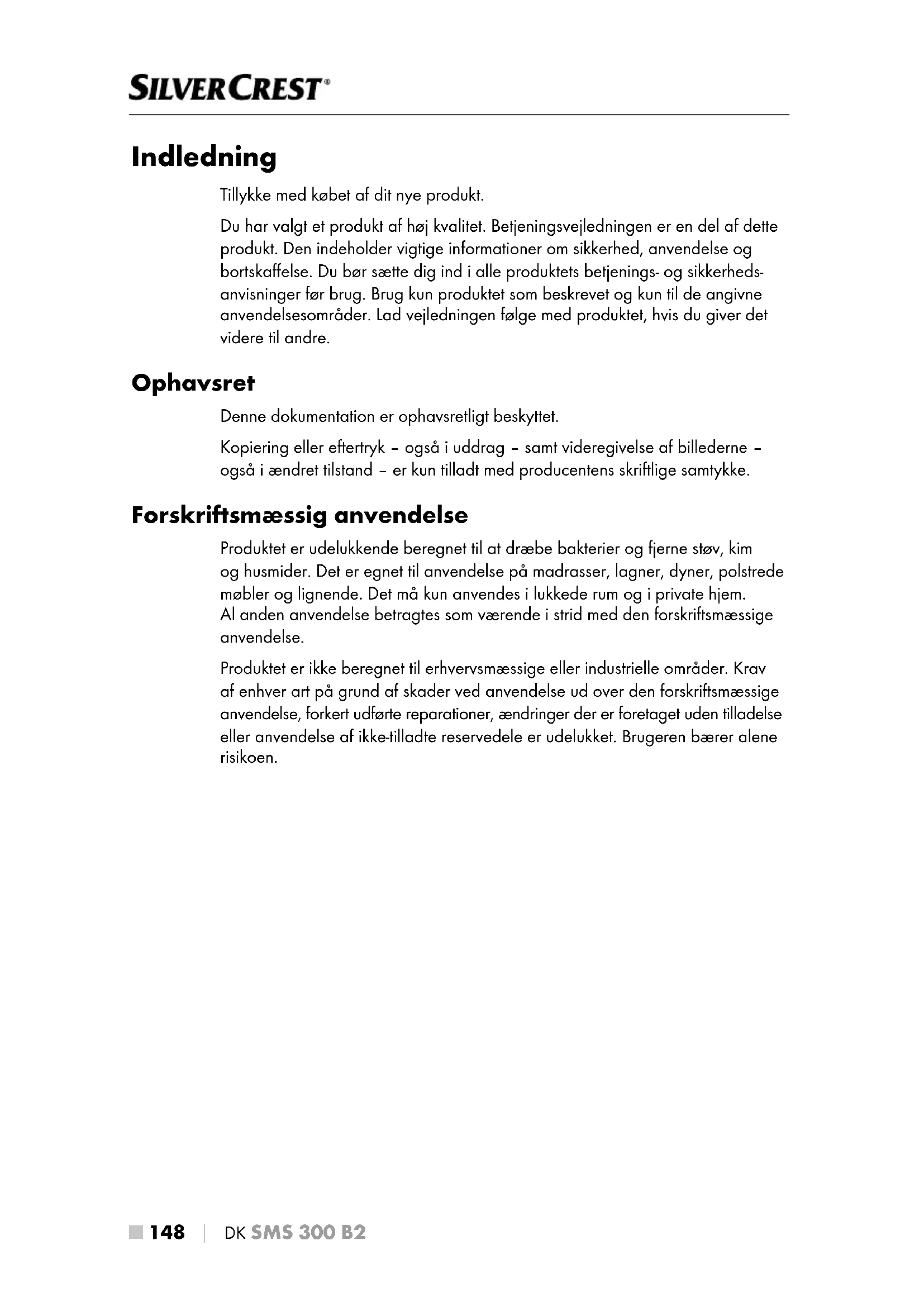 Indledning Tillykke med købet af dit nye produkt. Du har valgt et produkt af høj kvalitet. Betjeningsvejledningen er en del af dette produkt. Den indeholder vigtige informationer om sikkerhed, anvendelse og bortskaffelse. Du bør sætte dig ind i alle produktets betjenings- og sikkerheds- anvisninger før brug. Brug kun produktet som beskrevet og kun til de angivne anvendelsesområder. Lad vejledningen følge med produktet, hvis du giver det videre til andre. Ophavsret Denne dokumentation er ophavsretligt beskyttet. Kopiering eller eftertryk – også i uddrag – samt videregivelse af billederne – også i ændret tilstand – er kun tilladt med producentens skriftlige samtykke. Forskriftsmæssig anvendelse Produktet er udelukkende beregnet til at dræbe bakterier og fjerne støv, kim og husmider. Det er egnet til anvendelse på madrasser, lagner, dyner, polstrede møbler og lignende. Det må kun anvendes i lukkede rum og i private hjem. Al anden anvendelse betragtes som værende i strid med den forskriftsmæssige anvendelse. Produktet er ikke beregnet til erhvervsmæssige eller industrielle områder. Krav af enhver art på grund af skader ved anvendelse ud over den forskriftsmæssige anvendelse, forkert udførte reparationer, ændringer der er foretaget uden tilladelse eller anvendelse af ikke-tilladte reservedele er udelukket. Brugeren bærer alene risikoen.DK