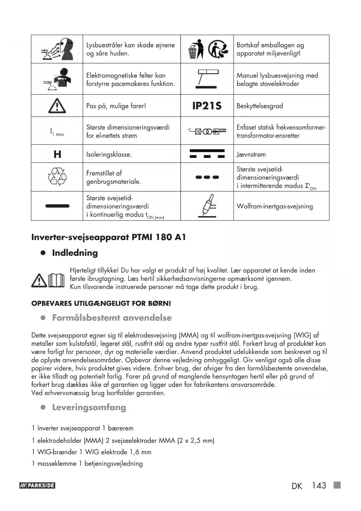 Største svejsetid- dimensioneringsværdi i kontinuerlig modus t ON (max) Wolfram-inertgas-svejsning Inverter-svejseapparat PTMI 180 A1 z Indledning Hjerteligt tillykke! Du har valgt et produkt af høj kvalitet. Lær apparatet at kende inden første ibrugtagning. Læs hertil sikkerhedsanvisningerne opmærksomt igennem. Kun tilsvarende instruerede personer må tage dette produkt i brug. OPBEVARES UTILGÆNGELIGT FOR BØRN! z Formålsbestemt anvendelse Dette svejseapparat egner sig til elektrodesvejsning (MMA) og til wolfram-inertgas-svejsning (WIG) af metaller som kulstofstål, legeret stål, rustfrit stål og andre typer rustfrit stål. Forkert brug af produktet kan være farligt for personer, dyr og materielle værdier. Anvend produktet udelukkende som beskrevet og til de oplyste anvendelsesområder. Opbevar denne vejledning omhyggeligt. Giv venligst også alle disse papirer videre, hvis produktet gives videre. Enhver brug, der afviger fra den formålsbestemte anvendelse, er ikke tilladt og potentielt farlig. Farer på grund af manglende hensyntagen hertil eller på grund af forkert brug dækkes ikke af garantien og ligger uden for fabrikantens ansvarsområde. Ved erhvervsmæssig brug bortfalder garantien. z Leveringsomfang 1 Inverter svejseapparat 1 bærerem 1 elektrodeholder (MMA) 2 svejseelektroder MMA (2 x 2,5 mm) 1 WIG-brænder 1 WIG elektrode 1,6 mm 1 masseklemme 1 betjeningsvejledning144