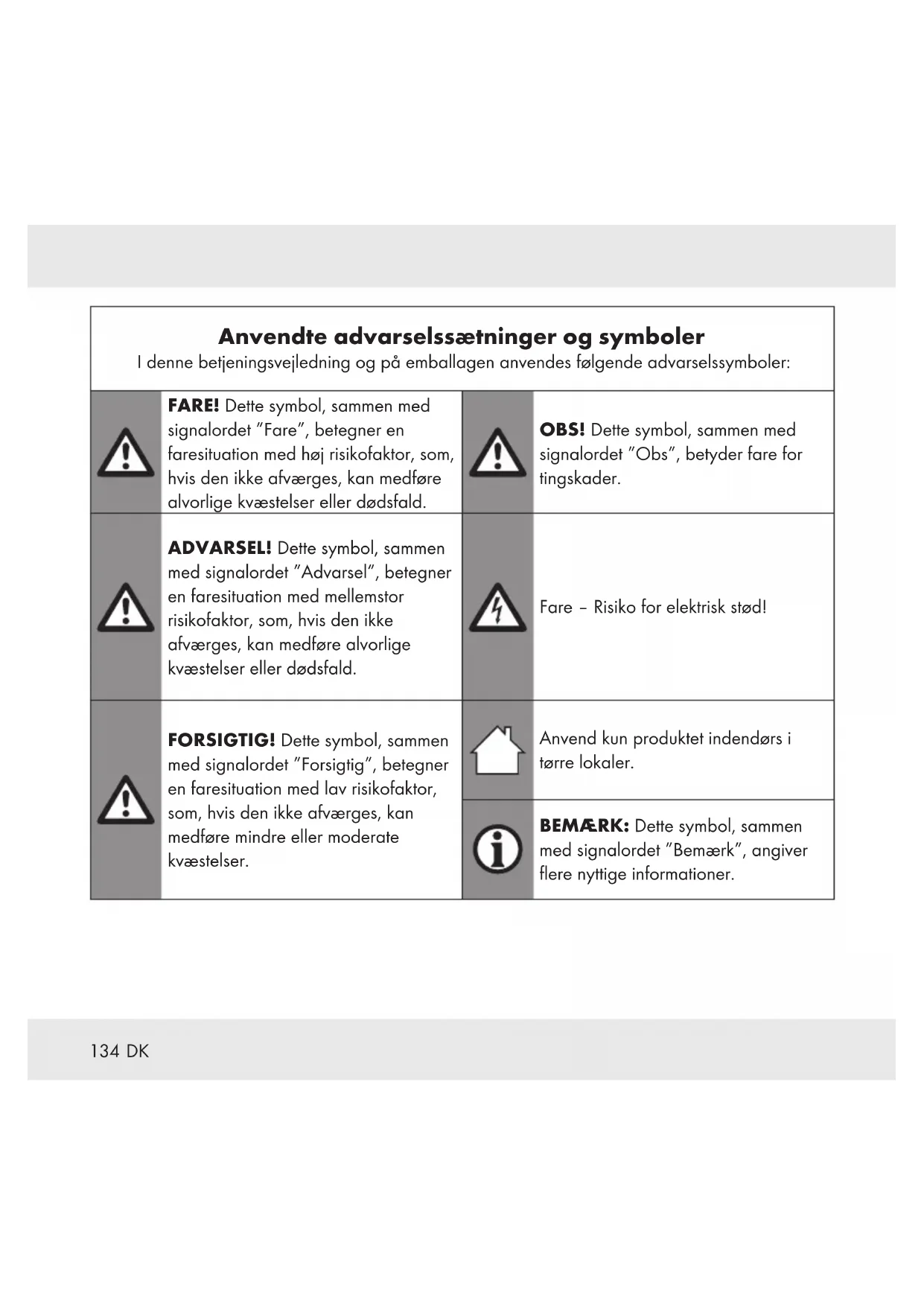 Anvendte advarselssætninger og symboler I denne betjeningsvejledning og på emballagen anvendes følgende advarselssymboler: FARE! Dette symbol, sammen med signalordet ”Fare”, betegner en faresituation med høj risikofaktor, som, hvis den ikke afværges, kan medføre alvorlige kvæstelser eller dødsfald. OBS! Dette symbol, sammen med signalordet ”Obs”, betyder fare for tingskader. ADVARSEL! Dette symbol, sammen med signalordet ”Advarsel”, betegner en faresituation med mellemstor risikofaktor, som, hvis den ikke afværges, kan medføre alvorlige kvæstelser eller dødsfald. Fare– Risiko for elektrisk stød! FORSIGTIG! Dette symbol, sammen med signalordet ”Forsigtig”, betegner en faresituation med lav risikofaktor, som, hvis den ikke afværges, kan medføre mindre eller moderate kvæstelser. Anvend kun produktet indendørs i tørre lokaler. BEMÆRK: Dette symbol, sammen med signalordet ”Bemærk”, angiver flere nyttige informationer.135