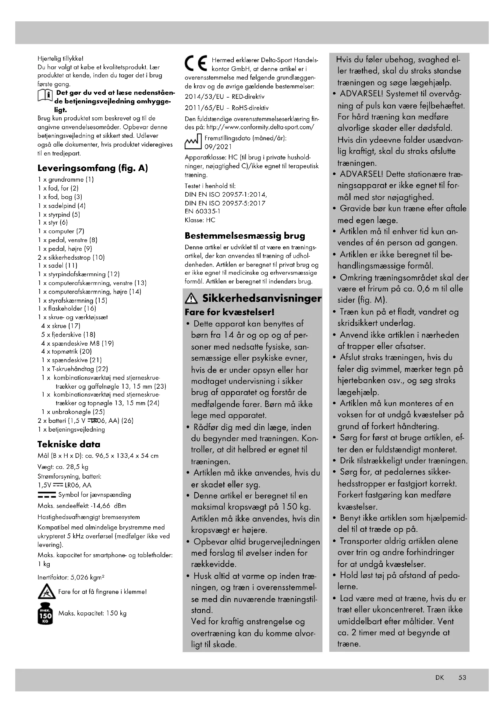 EN 60335-1 Klasse: HC Bestemmelsesmæssig brug Denne artikel er udviklet til at være en trænings- artikel, der kan anvendes til træning af udhol- denheden. Artiklen er beregnet til privat brug og er ikke egnet til medicinske og erhvervsmæssige formål. Artiklen er beregnet til indendørs brug. Sikkerhedsanvisninger Fare for kvæstelser!
