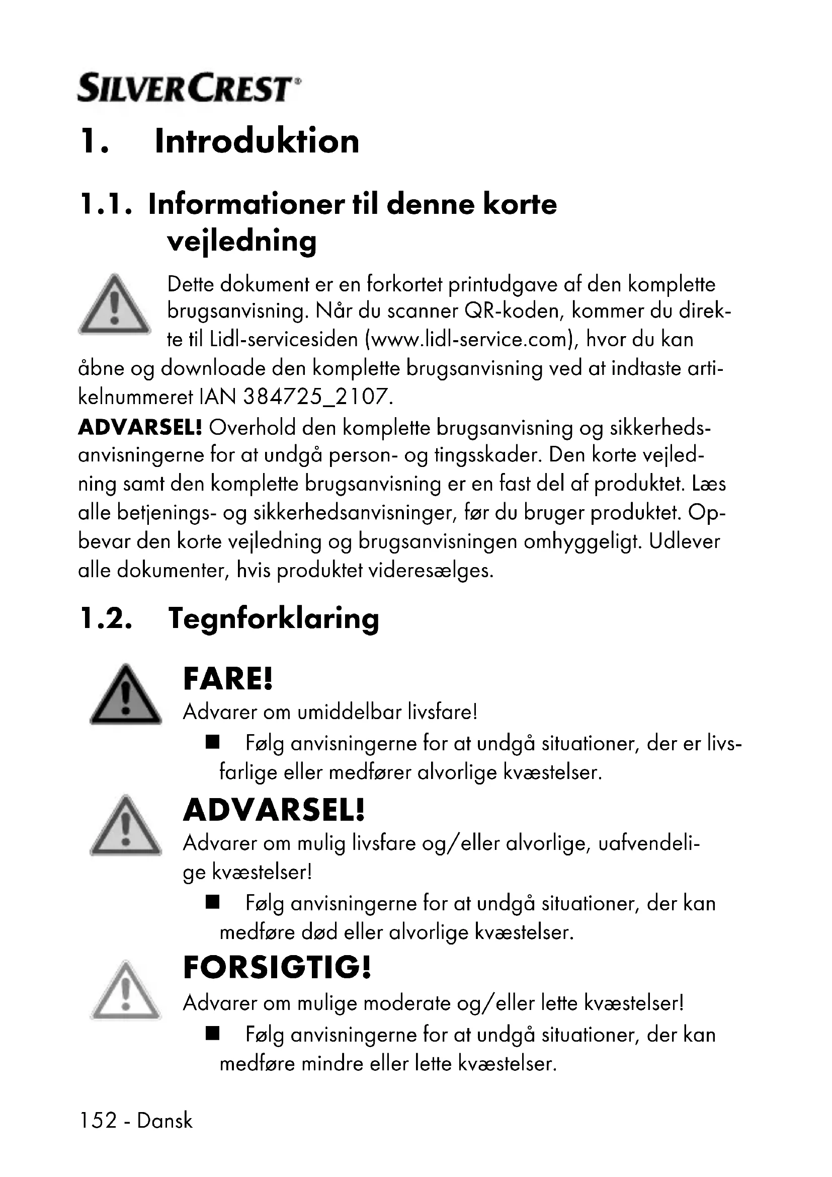 1.1. Informationer til denne korte vejledning Dette dokument er en forkortet printudgave af den komplette brugsanvisning. Når du scanner QR-koden, kommer du direk- te til Lidl-servicesiden (www.lidl-service.com), hvor du kan åbne og downloade den komplette brugsanvisning ved at indtaste arti- kelnummeret IAN 384725_2107. ADVARSEL! Overhold den komplette brugsanvisning og sikkerheds- anvisningerne for at undgå person- og tingsskader. Den korte vejled- ning samt den komplette brugsanvisning er en fast del af produktet. Læs alle betjenings- og sikkerhedsanvisninger, før du bruger produktet. Op- bevar den korte vejledning og brugsanvisningen omhyggeligt. Udlever alle dokumenter, hvis produktet videresælges. 1.2. Tegnforklaring FARE! Advarer om umiddelbar livsfare! Følg anvisningerne for at undgå situationer, der er livs- farlige eller medfører alvorlige kvæstelser. ADVARSEL! Advarer om mulig livsfare og/eller alvorlige, uafvendeli- ge kvæstelser! Følg anvisningerne for at undgå situationer, der kan medføre død eller alvorlige kvæstelser. FORSIGTIG! Advarer om mulige moderate og/eller lette kvæstelser! Følg anvisningerne for at undgå situationer, der kan medføre mindre eller lette kvæstelser.Dansk - 153 ADVARSEL! Advarer om fare på grund af elektrisk stød! BEMÆRK! Følg anvisningerne for at undgå tingsskader! Følg anvisningerne for at undgå situationer, der kan medføre tingsskader. Anvisninger vedrørende montering eller drift Følg anvisningerne i denne brugsanvisning!