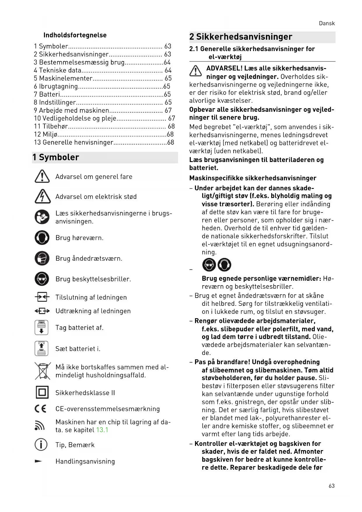 - 13 Generelle henvisninger 1 Symboler Advarsel om generel fare Advarsel om elektrisk stød Læs sikkerhedsanvisningerne i brugs anvisningen. Brug høreværn. Brug åndedrætsværn. Brug beskyttelsesbriller. Tilslutning af ledningen Udtrækning af ledningen Tag batteriet af. Sæt batteriet i. Må ikke bortskaffes sammen med al mindeligt husholdningsaffald. Sikkerhedsklasse II CE-overensstemmelsesmærkning Maskinen har en chip til lagring af da ta. se kapitel13.1 Tip, Bemærk Handlingsanvisning 2 Sikkerhedsanvisninger p. 68