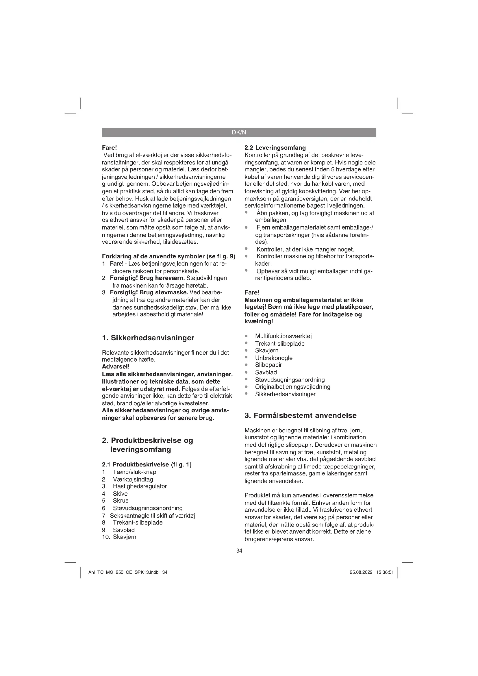 Maskinen er beregnet til slibning af træ, jern, kunststof og lignende materialer i kombination med det rigtige slibepapir. Derudover er maskinen beregnet til savning af træ, kunststof, metal og lignende materialer vha. det pågældende savblad samt til afskrabning af limede tæppebelægninger, rester fra spartelmasse, gamle lakeringer samt lignende anvendelser. Produktet må kun anvendes i overensstemmelse med det tiltænkte formål. Enhver anden form for anvendelse er ikke tilladt. Vi fraskriver os ethvert ansvar for skader, det være sig på personer eller materiel, der måtte opstå som følge af, at produk- tet ikke er blevet anvendt korrekt. Dette er alene brugerens/ejerens ansvar. Anl_TC_MG_250_CE_SPK13.indb 34Anl_TC_MG_250_CE_SPK13.indb 34 25.08.2022 13:36:5125.08.2022 13:36:51DK/N