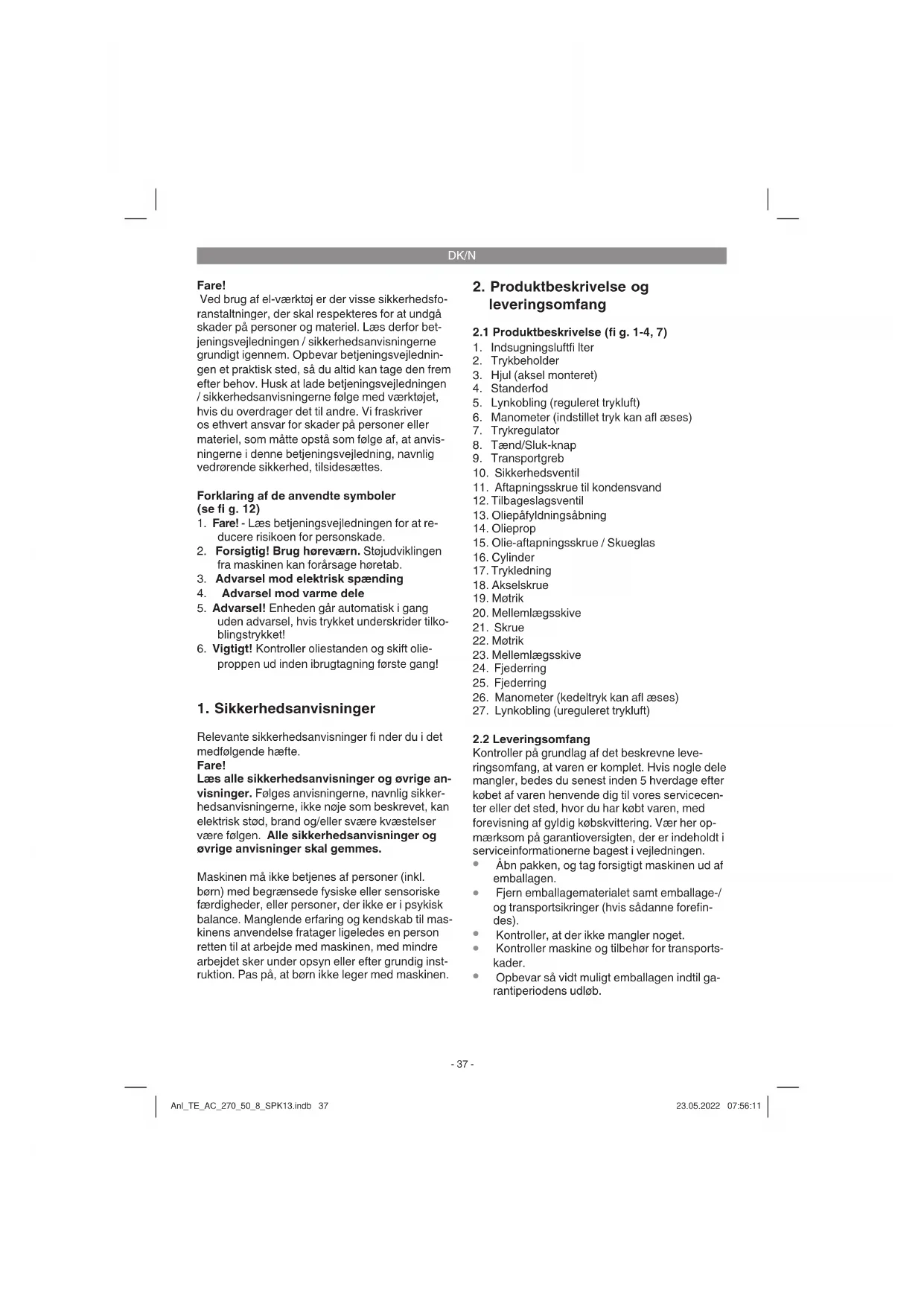 Bemærk! Hver gang efter brug skal kondensvan- det aftappes ved at åbne aftapningsskruen (11) – så holder trykbeholderen (2) længere. Undersøg trykbeholderen for rust og skader hver gang før brug. Kompressoren må ikke benyttes Anl_TE_AC_270_50_8_SPK13.indb 39Anl_TE_AC_270_50_8_SPK13.indb 39 23.05.2022 07:56:1223.05.2022 07:56:12DK/N