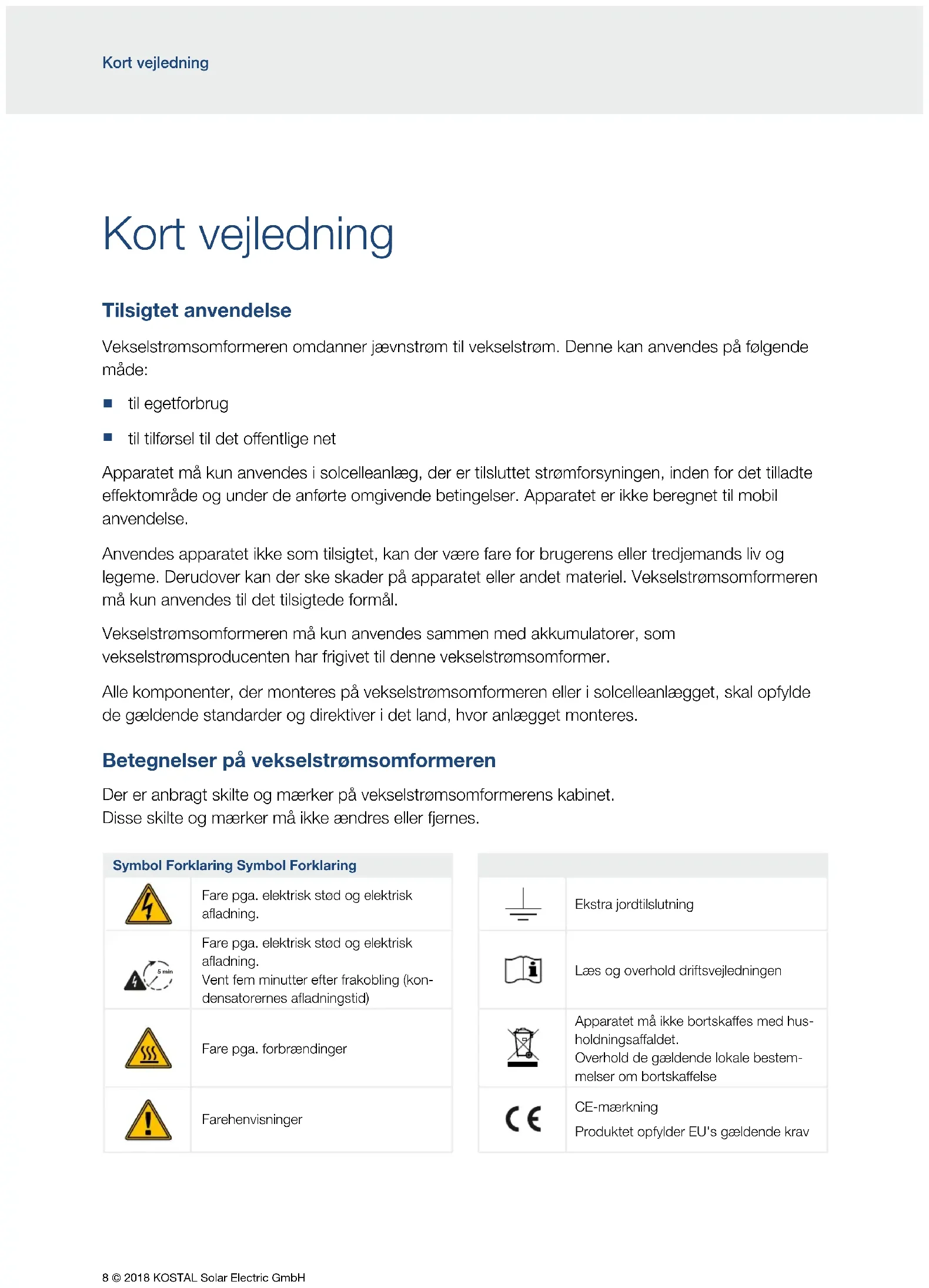 til tilførsel til det oentlige net Apparatet må kun anvendes i solcelleanlæg, der er tilsluttet strømforsyningen, inden for det tilladte eektområde og under de anførte omgivende betingelser. Apparatet er ikke beregnet til mobil anvendelse. Anvendes apparatet ikke som tilsigtet, kan der være fare for brugerens eller tredjemands liv og legeme. Derudover kan der ske skader på apparatet eller andet materiel. Vekselstrømsomformeren må kun anvendes til det tilsigtede formål. Vekselstrømsomformeren må kun anvendes sammen med akkumulatorer, som vekselstrømsproducenten har frigivet til denne vekselstrømsomformer. Alle komponenter, der monteres på vekselstrømsomformeren eller i solcelleanlægget, skal opfylde de gældende standarder og direktiver i det land, hvor anlægget monteres. Betegnelser på vekselstrømsomformeren Der er anbragt skilte og mærker på vekselstrømsomformerens kabinet. Disse skilte og mærker må ikke ændres eller fjernes. Symbol Forklaring Symbol Forklaring Fare pga. elektrisk stød og elektrisk afladning. Ekstra jordtilslutning 5 min Fare pga. elektrisk stød og elektrisk afladning. Vent fem minutter efter frakobling (kon- densatorernes afladningstid) Læs og overhold driftsvejledningen 5 min Fare pga. forbrændinger Apparatet må ikke bortskaes med hus- holdningsaaldet. Overhold de gældende lokale bestem- melser om bortskaelse Farehenvisninger CE-mærkning Produktet opfylder EU's gældende krav© 2018 KOSTAL Solar Electric GmbH 9