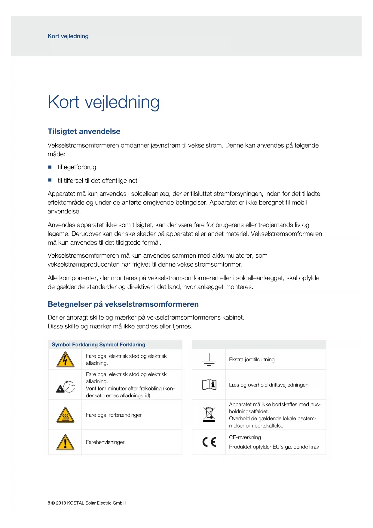 til tilførsel til det oentlige net Apparatet må kun anvendes i solcelleanlæg, der er tilsluttet strømforsyningen, inden for det tilladte eektområde og under de anførte omgivende betingelser. Apparatet er ikke beregnet til mobil anvendelse. Anvendes apparatet ikke som tilsigtet, kan der være fare for brugerens eller tredjemands liv og legeme. Derudover kan der ske skader på apparatet eller andet materiel. Vekselstrømsomformeren må kun anvendes til det tilsigtede formål. Vekselstrømsomformeren må kun anvendes sammen med akkumulatorer, som vekselstrømsproducenten har frigivet til denne vekselstrømsomformer. Alle komponenter, der monteres på vekselstrømsomformeren eller i solcelleanlægget, skal opfylde de gældende standarder og direktiver i det land, hvor anlægget monteres. Betegnelser på vekselstrømsomformeren Der er anbragt skilte og mærker på vekselstrømsomformerens kabinet. Disse skilte og mærker må ikke ændres eller fjernes. Symbol Forklaring Symbol Forklaring Fare pga. elektrisk stød og elektrisk afladning. Ekstra jordtilslutning 5 min Fare pga. elektrisk stød og elektrisk afladning. Vent fem minutter efter frakobling (kon- densatorernes afladningstid) Læs og overhold driftsvejledningen 5 min Fare pga. forbrændinger Apparatet må ikke bortskaes med hus- holdningsaaldet. Overhold de gældende lokale bestem- melser om bortskaelse Farehenvisninger CE-mærkning Produktet opfylder EU's gældende krav© 2018 KOSTAL Solar Electric GmbH 9