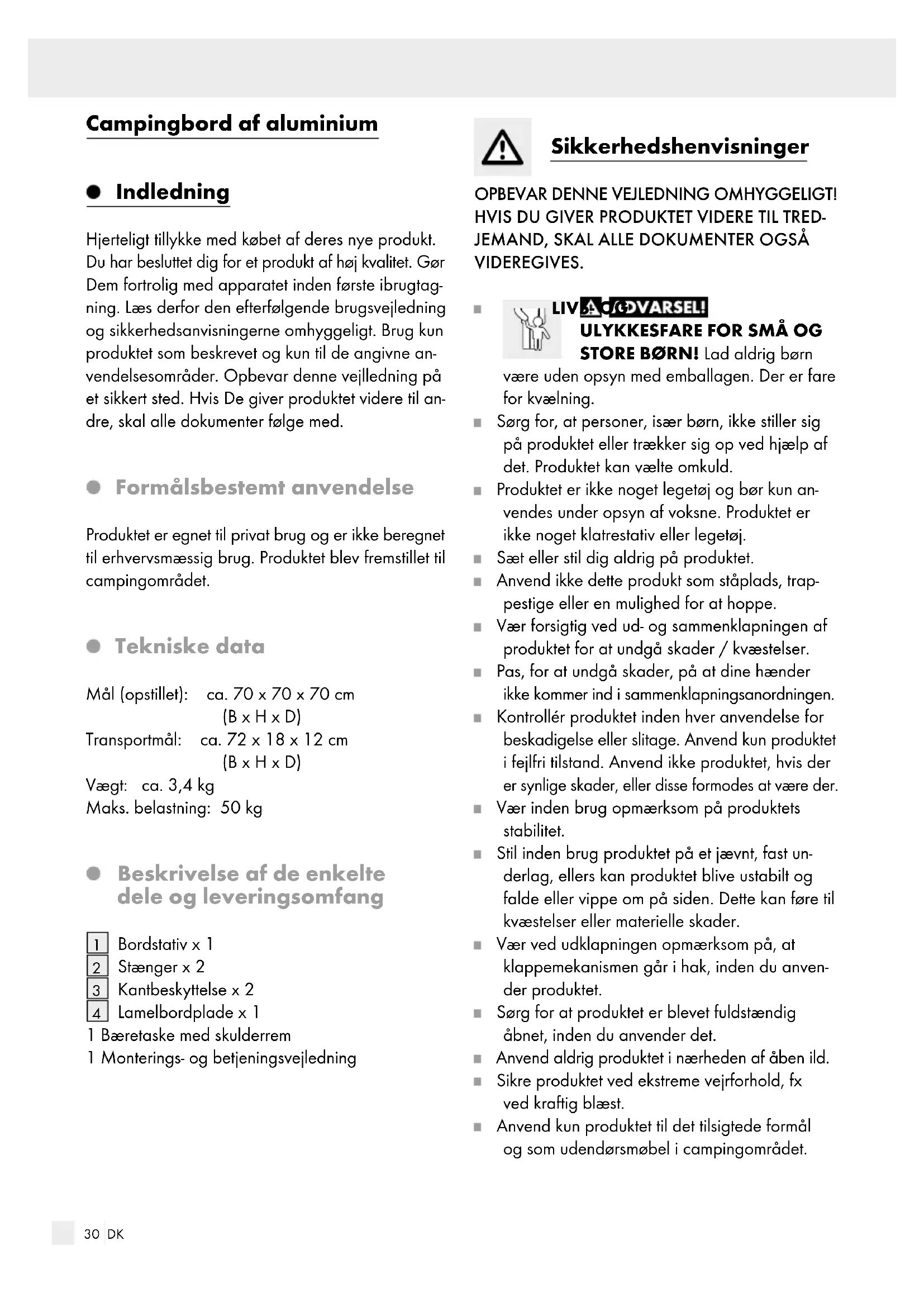 STORE BØRN! Lad aldrig børn være uden opsyn med emballagen. Der er fare for kvælning. Sørg for, at personer, især børn, ikke stiller sig på produktet eller trækker sig op ved hjælp af det. Produktet kan vælte omkuld. Produktet er ikke noget legetøj og bør kun an- vendes under opsyn af voksne. Produktet er ikke noget klatrestativ eller legetøj. Sæt eller stil dig aldrig på produktet. Anvend ikke dette produkt som ståplads, trap- pestige eller en mulighed for at hoppe. Vær forsigtig ved ud- og sammenklapningen af produktet for at undgå skader / kvæstelser. Pas, for at undgå skader, på at dine hænder ikke kommer ind i sammenklapningsanordningen. Kontrollér produktet inden hver anvendelse for beskadigelse eller slitage. Anvend kun produktet i fejlfri tilstand. Anvend ikke produktet, hvis der er synlige skader, eller disse formodes at være der. Vær inden brug opmærksom på produktets stabilitet. Stil inden brug produktet på et jævnt, fast un- derlag, ellers kan produktet blive ustabilt og falde eller vippe om på siden. Dette kan føre til kvæstelser eller materielle skader. Vær ved udklapningen opmærksom på, at klappemekanismen går i hak, inden du anven- der produktet. Sørg for at produktet er blevet fuldstændig åbnet, inden du anvender det. Anvend aldrig produktet i nærheden af åben ild. Sikre produktet ved ekstreme vejrforhold, fx ved kraftig blæst. Anvend kun produktet til det tilsigtede formål og som udendørsmøbel i campingområdet.31 DK Vær opmærksom på den maksimale belastbar- hed (se „Tekniske data“). Hvis denne vægtgrænse overskrides, kan dette føre til personskader og / eller materielle skader. På grund af den hurtige og nemme samling af produktet er det ikke så stabilt som et normalt bord. Belast ikke bordet med mere end 50 kg og undgå sidebelastning, da bordet kan vælte hurtigere end konventionelle udendørsborde på grund af dets lave vægt. Anbring ikke en parasol på bordet. Brug kun en parasol med eget stel. RISIKO FOR MATERIELLE SKADER! Vi hæfter ikke for ulykker, der opstår på grund af manglende overholdelse af ovenstående sikker- hedshenvisninger eller gennem forkert håndtering. Montering af produktet Tag produktet ud af bæretasken. Træk langsomt og jævnt bordstativet