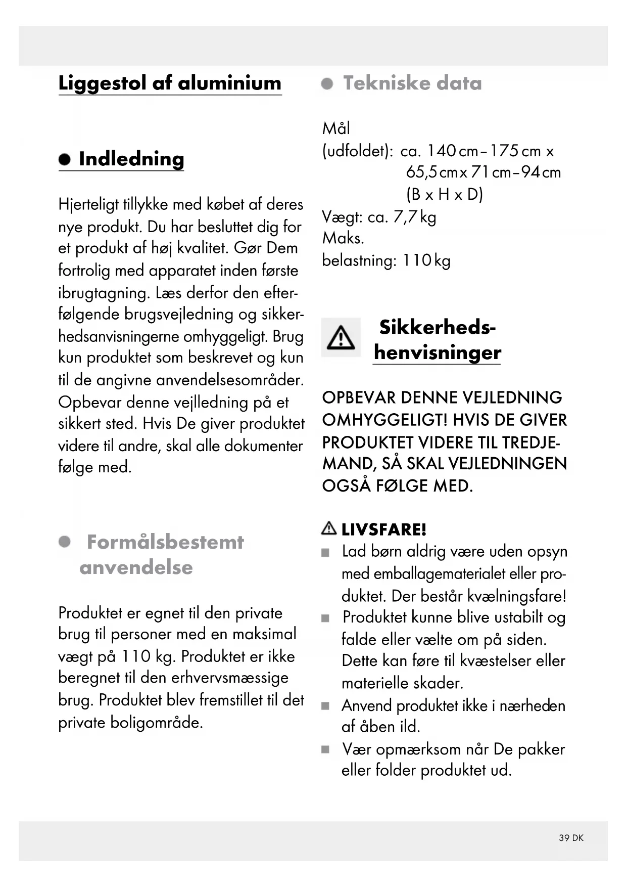 af åben ild. Vær opmærksom når De pakker eller folder produktet ud.40 DK Vær opmærksom på produktets rette stabilitet inden brug. Vær opmærksom på at artiklen stilles på en jævn og stabil over- flade. Vær opmærksom på den maksi- male belastbarhed på 110 kg. Når denne vægtgrænse over- skrides, kan dette føre til person- og / eller materielle skader. Hold deres hænder på afstand fra klapmekanismen for at undgå kvæstelser. Sørg inden anvendelsen af pro- duktet for, at klapmekanismen er rigtig spærret. Sørg for at produktet er blevet fuldstændig åbnet inden De an- vender det. Produktet må kun anvendes under opsyn af en voksen person og ikke anvendes som legetøj. Produktet må altid kun anvendes af en person. Kontrollér produktet inden hver anvendelse for beskadigelse eller slitage. Anvend produktet kun i fejlfri tilstand. Anvend ikke pro- duktet når skader er synlige eller formodes at være der. Sikre produktet ved ekstreme vejr- forhold, f.eks. ved kraftig vind. Op- bevar produktet i beskyttede rum. Må ikke stå på produktet.