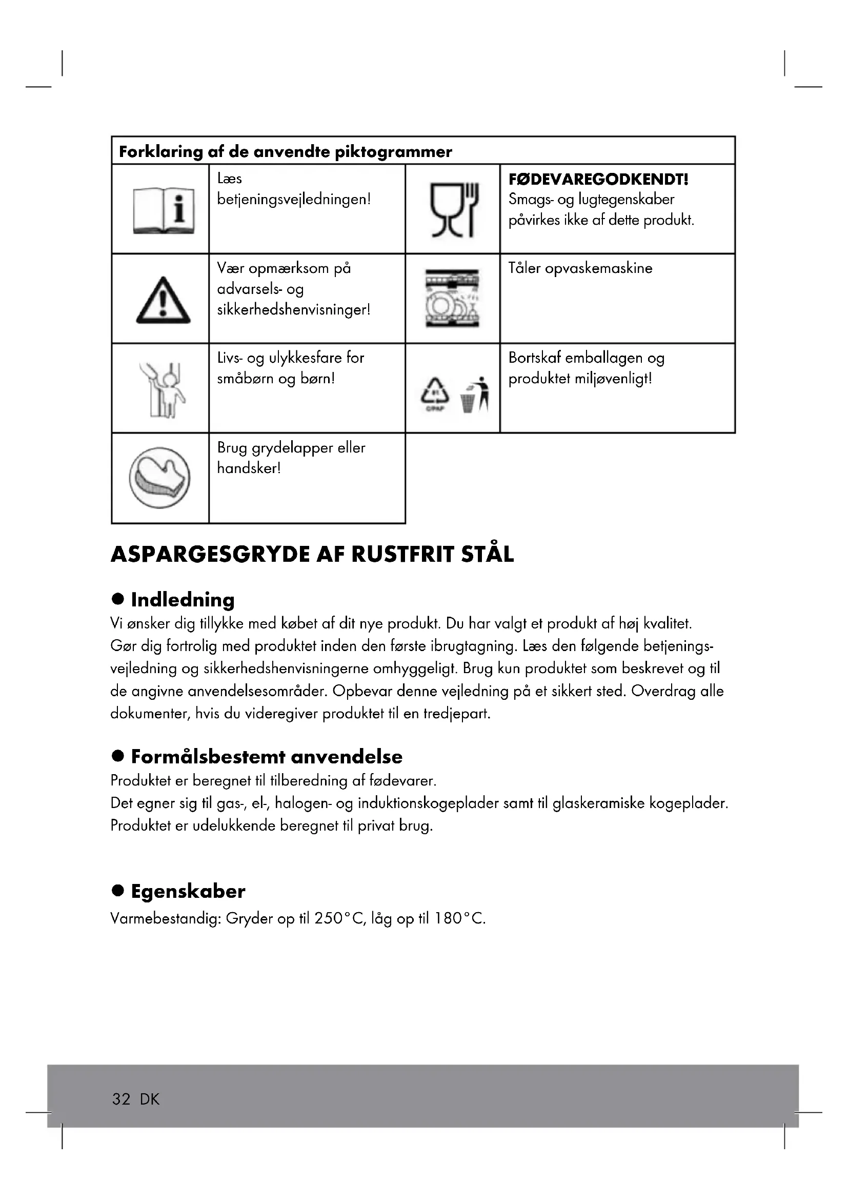 l Indledning Vi ønsker dig tillykke med købet af dit nye produkt. Du har valgt et produkt af høj kvalitet. Gør dig fortrolig med produktet inden den første ibrugtagning. Læs den følgende betjenings- vejledning og sikkerhedshenvisningerne omhyggeligt. Brug kun produktet som beskrevet og til de angivne anvendelsesområder. Opbevar denne vejledning på et sikkert sted. Overdrag alle dokumenter, hvis du videregiver produktet til en tredjepart. l Formålsbestemt anvendelse Produktet er beregnet til tilberedning af fødevarer. Det egner sig til gas-, el-, halogen- og induktionskogeplader samt til glaskeramiske kogeplader. Produktet er udelukkende beregnet til privat brug. l Egenskaber Varmebestandig: Gryder op til 250°C, låg op til 180°C. 32 DKl Sikkerhedshenvisninger