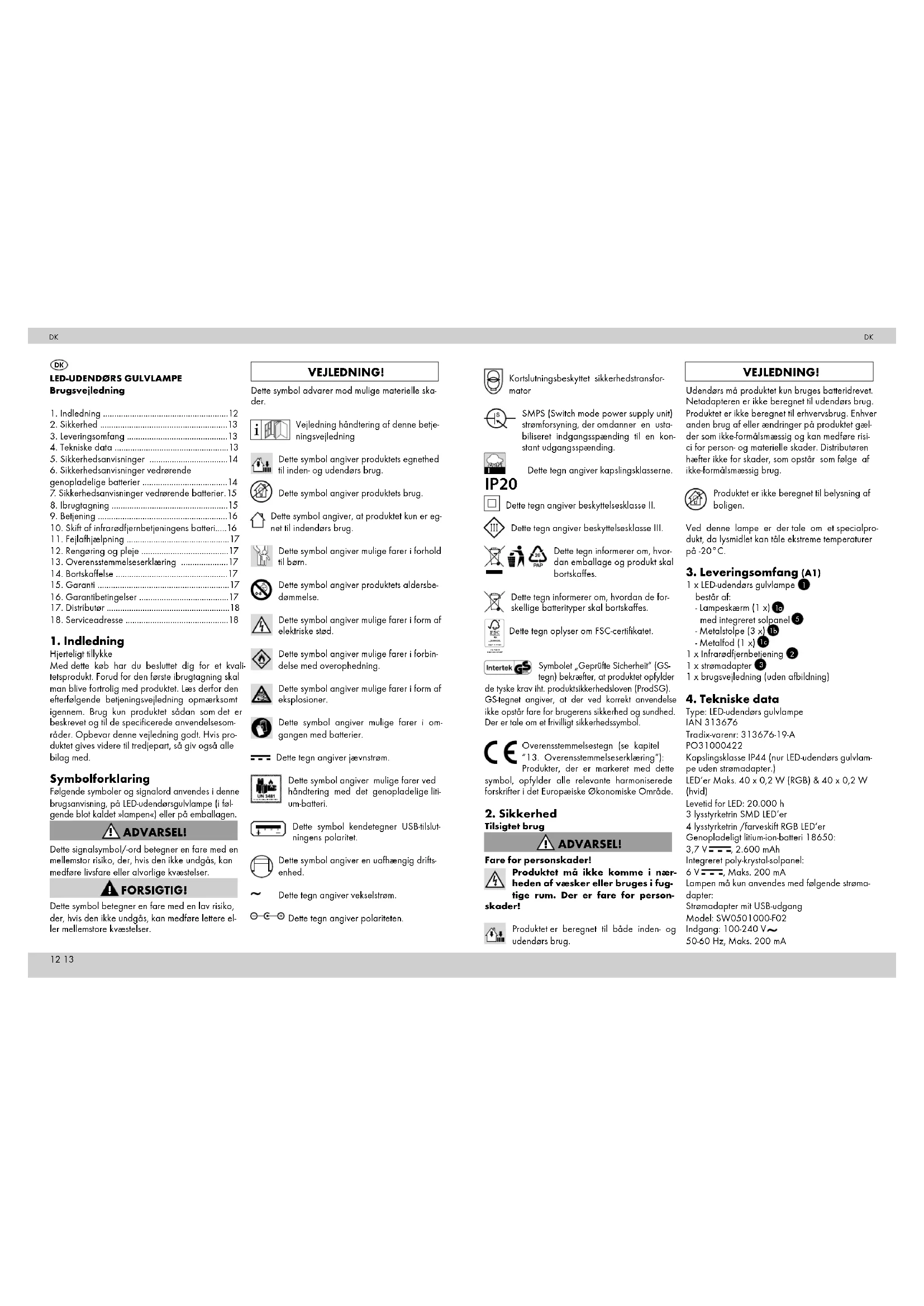 Type: LED-udendørs gulvlampe IAN 313676 Tradix-varenr: 313676-19-A PO31000422 Kapslingsklasse IP44 (nur LED-udendørs gulvlam- pe uden strømadapter.) LED’er Maks. 40 x 0,2 W (RGB) & 40 x 0,2 W (hvid) Levetid for LED: 20.000 h 3 lysstyrketrin SMD LED’er 4 lysstyrketrin /farveskift RGB LED’er Genopladeligt litium-ion-batteri 18650: 3,7 V , 2.600 mAh Integreret poly-krystal-solpanel: 6 V , Maks. 200 mA Lampen må kun anvendes med følgende strøma- dapter: Strømadapter mit USB-udgang Model: SW0501000-F02 Indgang: 100-240 V 50-60 Hz, Maks. 200 mA DKDK DK14 15 Udgang: 5 V , 1.000 mA - Polaritet: 2 forskellige oplademuligheder: - Solpanel (integreret) eller strømadapter - Strømadapterens opladetid: ca. 6 timer Opladetiden via strømpanelet afhænger af de pågældende solstråling. Infrarødfjernbetjening, inkl. CR2025 batteri, 3 V litium Mål LED-udendørs gulvlampe: - Diameter lampskærm: 34 cm - Højde lampe, monteret: ca. 150 cm Produktionsdato: 12/2018 Garanti: 3 år