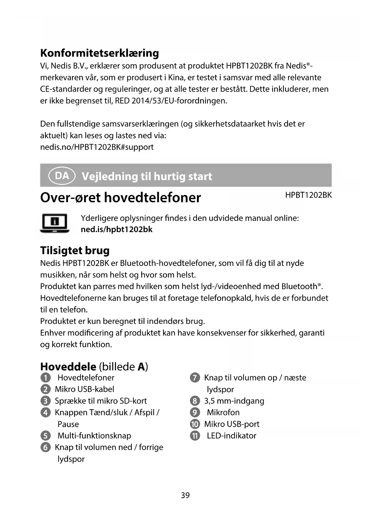 Vejledning til hurtig start Over-øret hovedtelefoner HPBT1202BK Yderligere oplysninger ndes i den udvidede manual online: ned.is/hpbt1202bk Tilsigtet brug Nedis HPBT1202BK er Bluetooth-hovedtelefoner, som vil få dig til at nyde musikken, når som helst og hvor som helst. Produktet kan parres med hvilken som helst lyd-/videoenhed med Bluetooth®. Hovedtelefonerne kan bruges til at foretage telefonopkald, hvis de er forbundet til en telefon. Produktet er kun beregnet til indendørs brug. Enhver modicering af produktet kan have konsekvenser for sikkerhed, garanti og korrekt funktion. Hoveddele (billede A) 1 Hovedtelefoner 2 Mikro USB-kabel 3 Sprække til mikro SD-kort 4 Knappen Tænd/sluk / Afspil / Pause 5 Multi-funktionsknap 6 Knap til volumen ned / forrige lydspor 7 Knap til volumen op / næste lydspor 8 3,5 mm-indgang 9 Mikrofon q Mikro USB-port w LED-indikator40 Sikkerhedsinstruktioner Ikon Beskrivelse Meddelelse om, at produktet kan forårsage høreskade. Lyt ikke ved høj lydstyrke i længere perioder.