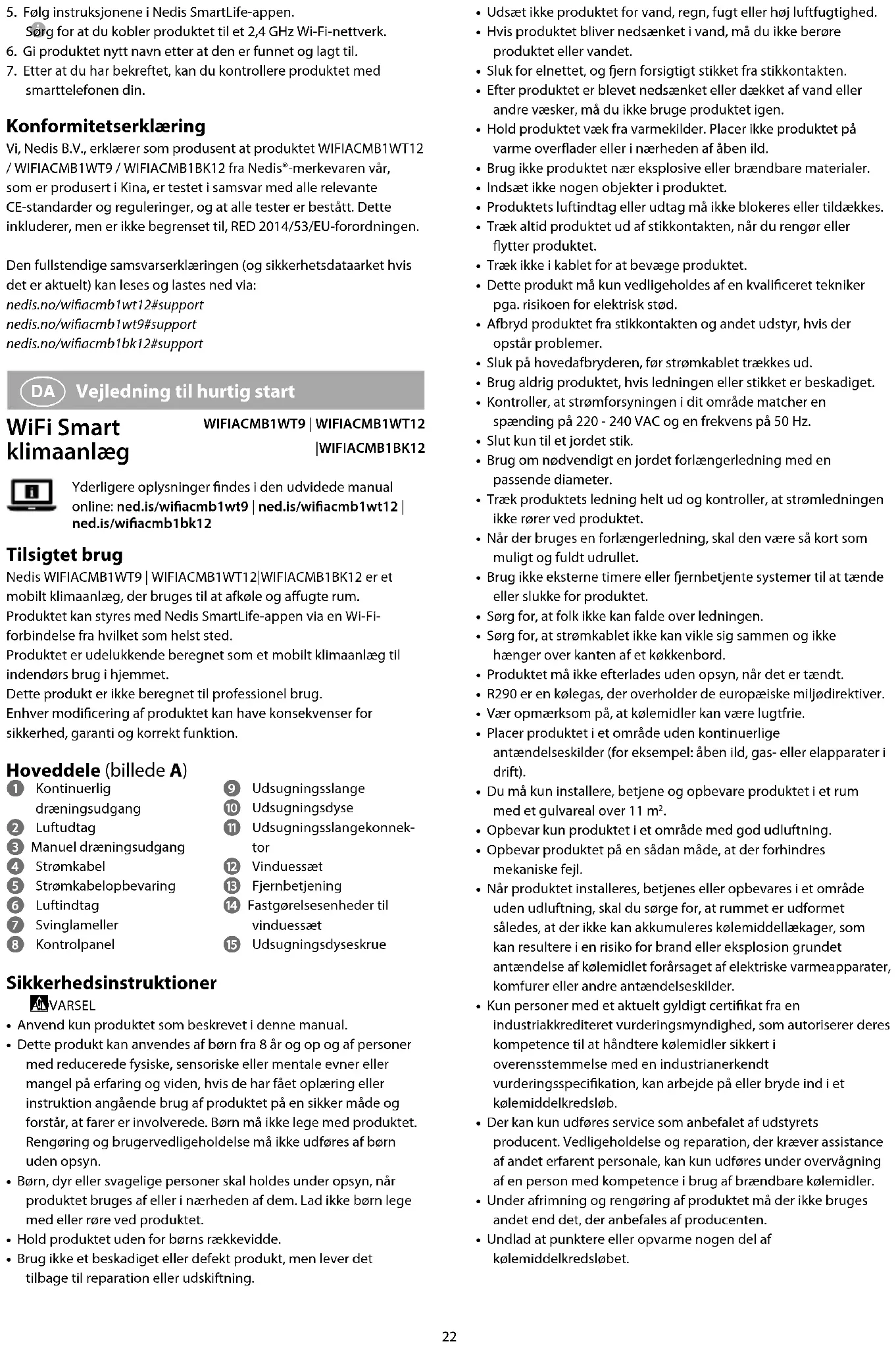 Vejledning til hurtig start WiFi Smart klimaanlæg WIFIACMB1WT9 | WIFIACMB1WT12|WIFIACMB1BK12Yderligere oplysninger ndes i den udvidede manual online: ned.is/wiacmb1wt9 | ned.is/wiacmb1wt12 | ned.is/wiacmb1bk12 Tilsigtet brug Nedis WIFIACMB1WT9 | WIFIACMB1WT12|WIFIACMB1BK12 er et mobilt klimaanlæg, der bruges til at afkøle og augte rum.Produktet kan styres med Nedis SmartLife-appen via en Wi-Fi-forbindelse fra hvilket som helst sted.Produktet er udelukkende beregnet som et mobilt klimaanlæg til indendørs brug i hjemmet.Dette produkt er ikke beregnet til professionel brug.Enhver modicering af produktet kan have konsekvenser for sikkerhed, garanti og korrekt funktion. Hoveddele (billede A) 1 Kontinuerlig dræningsudgang2 Luftudtag3 Manuel dræningsudgang4 Strømkabel5 Strømkabelopbevaring6 Luftindtag7 Svinglameller8 Kontrolpanel9 Udsugningsslangeq Udsugningsdysew Udsugningsslangekonnek- tor e Vinduessætr Fjernbetjeningt Fastgørelsesenheder til vinduessæty Udsugningsdyseskrue Sikkerhedsinstruktioner