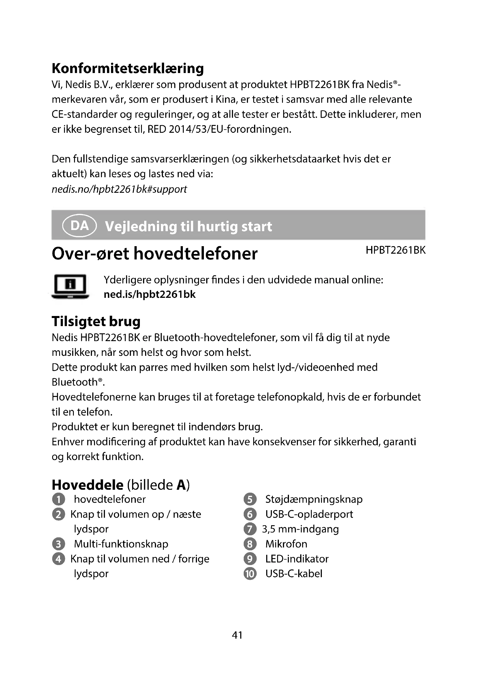 Vejledning til hurtig start Over-øret hovedtelefoner HPBT2261BK Yderligere oplysninger ndes i den udvidede manual online: ned.is/hpbt2261bk Tilsigtet brug Nedis HPBT2261BK er Bluetooth-hovedtelefoner, som vil få dig til at nyde musikken, når som helst og hvor som helst. Dette produkt kan parres med hvilken som helst lyd-/videoenhed med Bluetooth®. Hovedtelefonerne kan bruges til at foretage telefonopkald, hvis de er forbundet til en telefon. Produktet er kun beregnet til indendørs brug. Enhver modicering af produktet kan have konsekvenser for sikkerhed, garanti og korrekt funktion. Hoveddele (billede A) 1 hovedtelefoner 2 Knap til volumen op / næste lydspor 3 Multi-funktionsknap 4 Knap til volumen ned / forrige lydspor 5 Støjdæmpningsknap 6 USB-C-opladerport 7 3,5 mm-indgang 8 Mikrofon 9 LED-indikator q USB-C-kabel42 Sikkerhedsinstruktioner Ikon Beskrivelse Meddelelse om, at produktet kan forårsage høreskade. Lyt ikke ved høj lydstyrke i længere perioder.