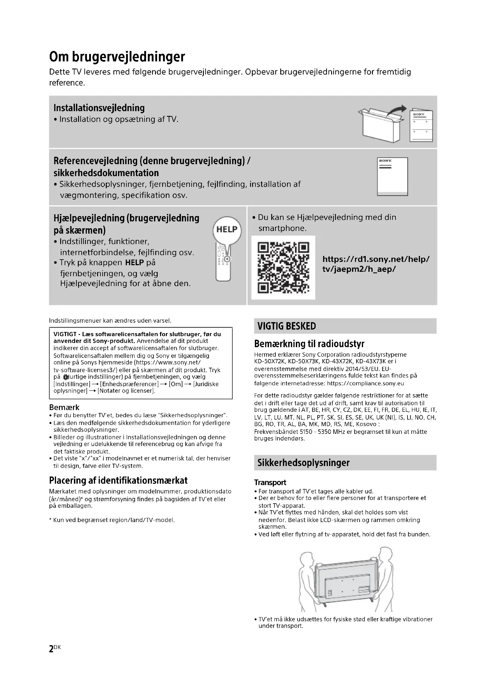 - Kun ved begrænset region/land/TV-model. Bemærkning til radioudstyr Hermed erklærer Sony Corporation radioudstyrstyperne KD-50X72K, KD-50X73K, KD-43X72K, KD-43X73K er i overensstemmelse med direktiv 2014/53/EU. EU- overensstemmelseserklæringens fulde tekst kan findes på følgende internetadresse: https://compliance.sony.eu For dette radioudstyr gælder følgende restriktioner for at sætte det i drift eller tage det ud af drift, samt krav til autorisation til brug gældende i AT, BE, HR, CY, CZ, DK, EE, FI, FR, DE, EL, HU, IE, IT, LV, LT, LU, MT, NL, PL, PT, SK, SI, ES, SE, UK, UK (NI), IS, LI, NO, CH, BG, RO, TR, AL, BA, MK, MD, RS, ME, Kosovo : Frekvensbåndet 5150 - 5350 MHz er begrænset til kun at måtte bruges indendørs. Transport