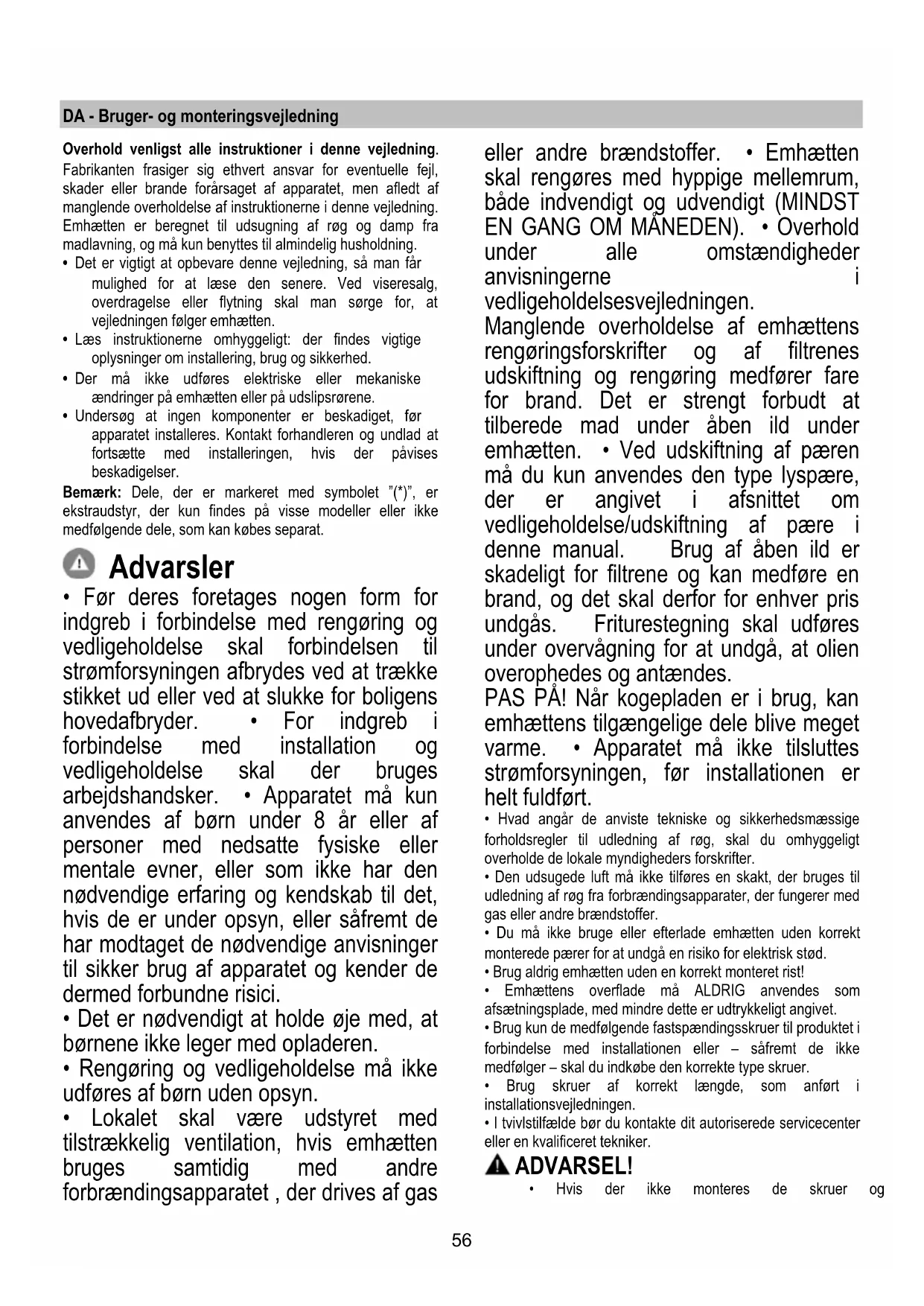 - Lokalet skal være udstyret med tilstrækkelig ventilation, hvis emhætten bruges samtidig med andre forbrændingsapparatet , der drives af gas eller andre brændstoffer. • Emhætten skal rengøres med hyppige mellemrum, både indvendigt og udvendigt (MINDST EN GANG OM MÅNEDEN). • Overhold under alle omstændigheder anvisningerne i vedligeholdelsesvejledningen. Manglende overholdelse af emhættens rengøringsforskrifter og af filtrenes udskiftning og rengøring medfører fare for brand. Det er strengt forbudt at tilberede mad under åben ild under emhætten. • Ved udskiftning af pæren må du kun anvendes den type lyspære, der er angivet i afsnittet om vedligeholdelse/udskiftning af pære i denne manual. Brug af åben ild er skadeligt for filtrene og kan medføre en brand, og det skal derfor for enhver pris undgås. Friturestegning skal udføres under overvågning for at undgå, at olien overophedes og antændes. PAS PÅ! Når kogepladen er i brug, kan emhættens tilgængelige dele blive meget varme. • Apparatet må ikke tilsluttes strømforsyningen, før installationen er helt fuldført.