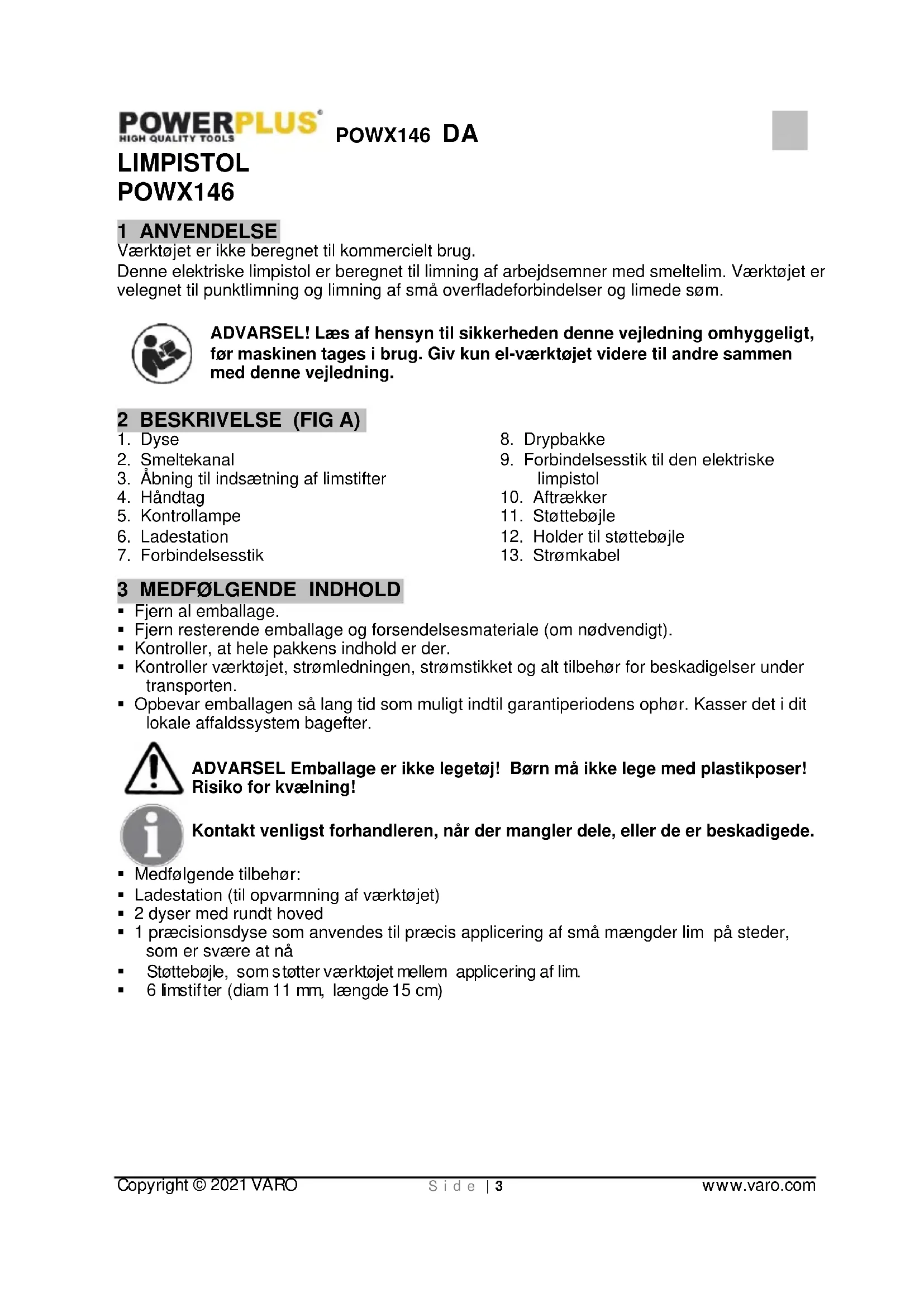 Copyright © 2021 VARO S i d e | 3 www.varo.com LIMPISTOL POWX146 1 ANVENDELSE Værktøjet er ikke beregnet til kommercielt brug. Denne elektriske limpistol er beregnet til limning af arbejdsemner med smeltelim. Værktøjet er velegnet til punktlimning og limning af små overfladeforbindelser og limede søm. ADVARSEL! Læs af hensyn til sikkerheden denne vejledning omhyggeligt, før maskinen tages i brug. Giv kun el-værktøjet videre til andre sammen med denne vejledning. 2 BESKRIVELSE (FIG A)